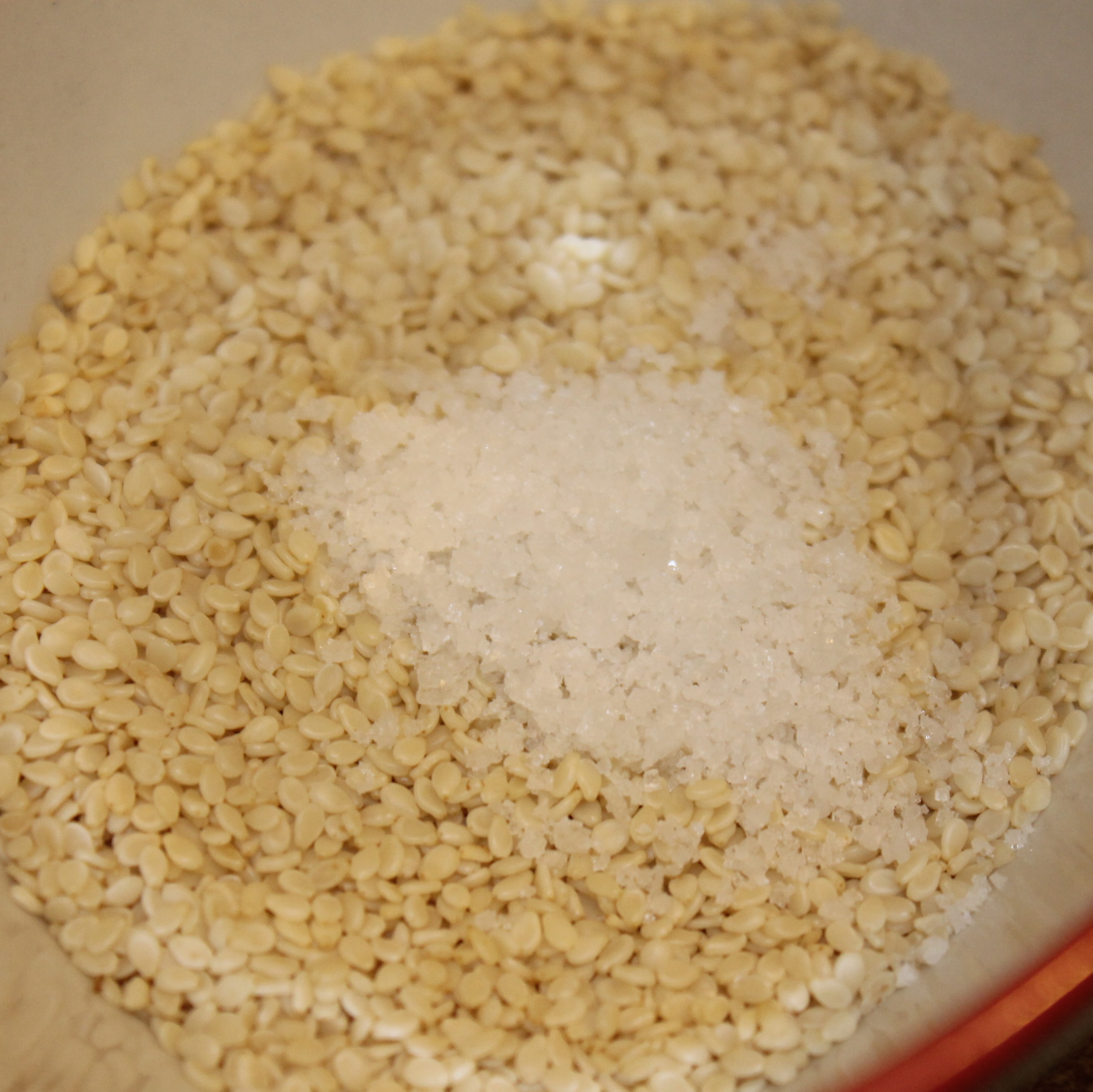 - Combine the sesame seeds with 3/8 teaspoon salt. (If you can find black sesame seeds also, use 2 tablespoons sesame seeds and 2 tablespoons black sesame seeds. That would have made the presentation so much nicer!)