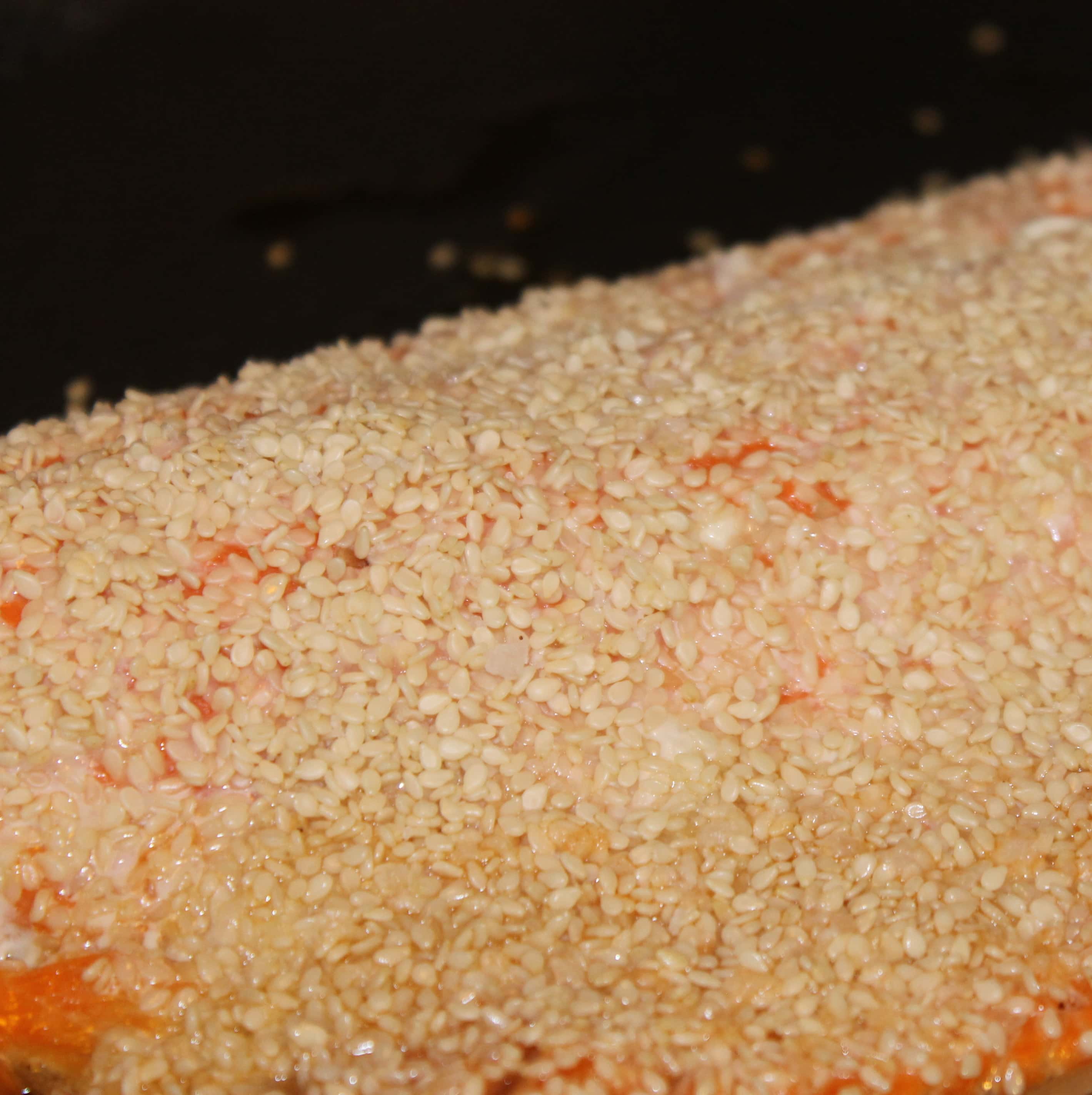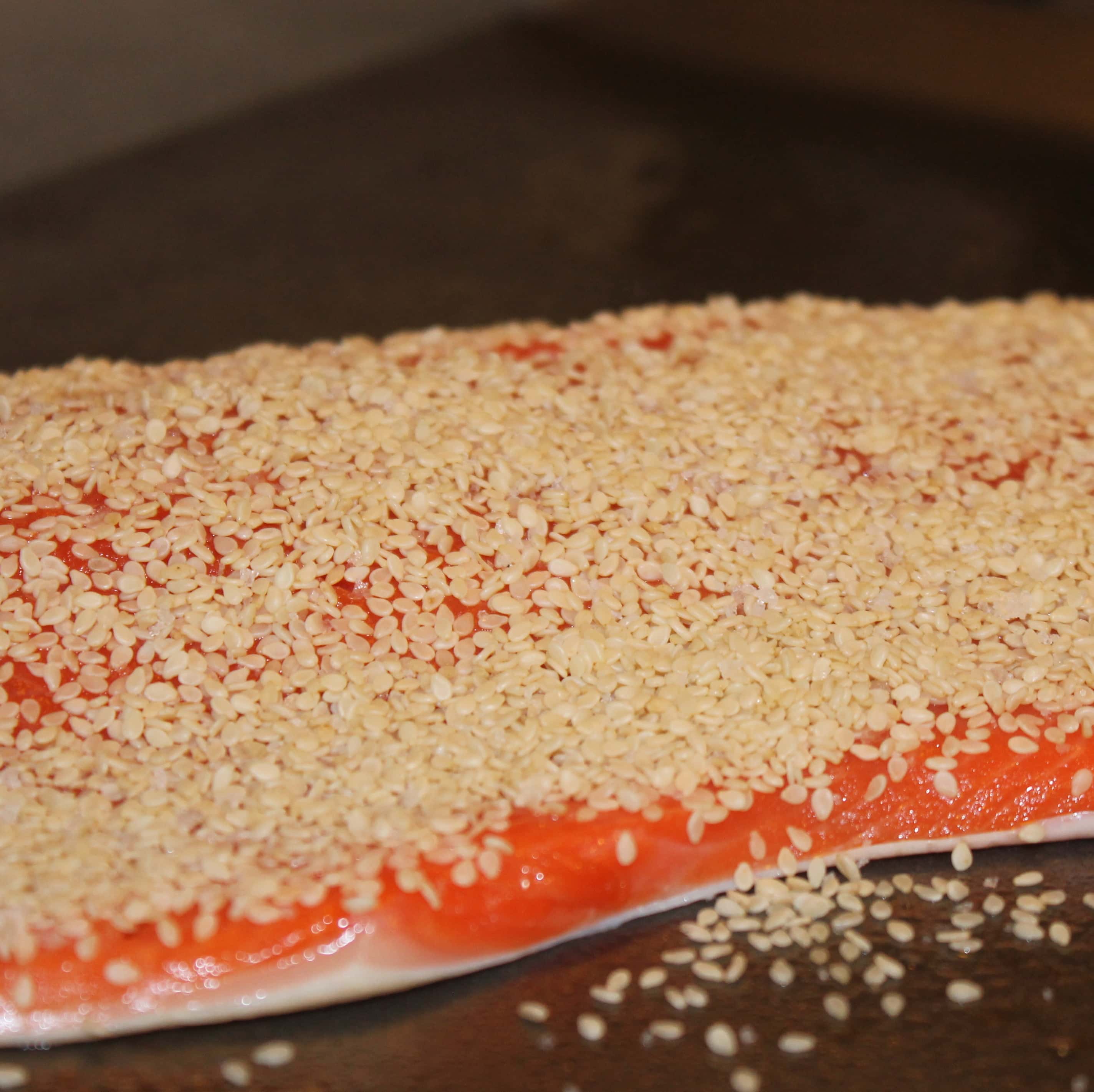 - Sprinkle the sesame seed mixture over the salmon, pressing gently so it sticks to the fish.