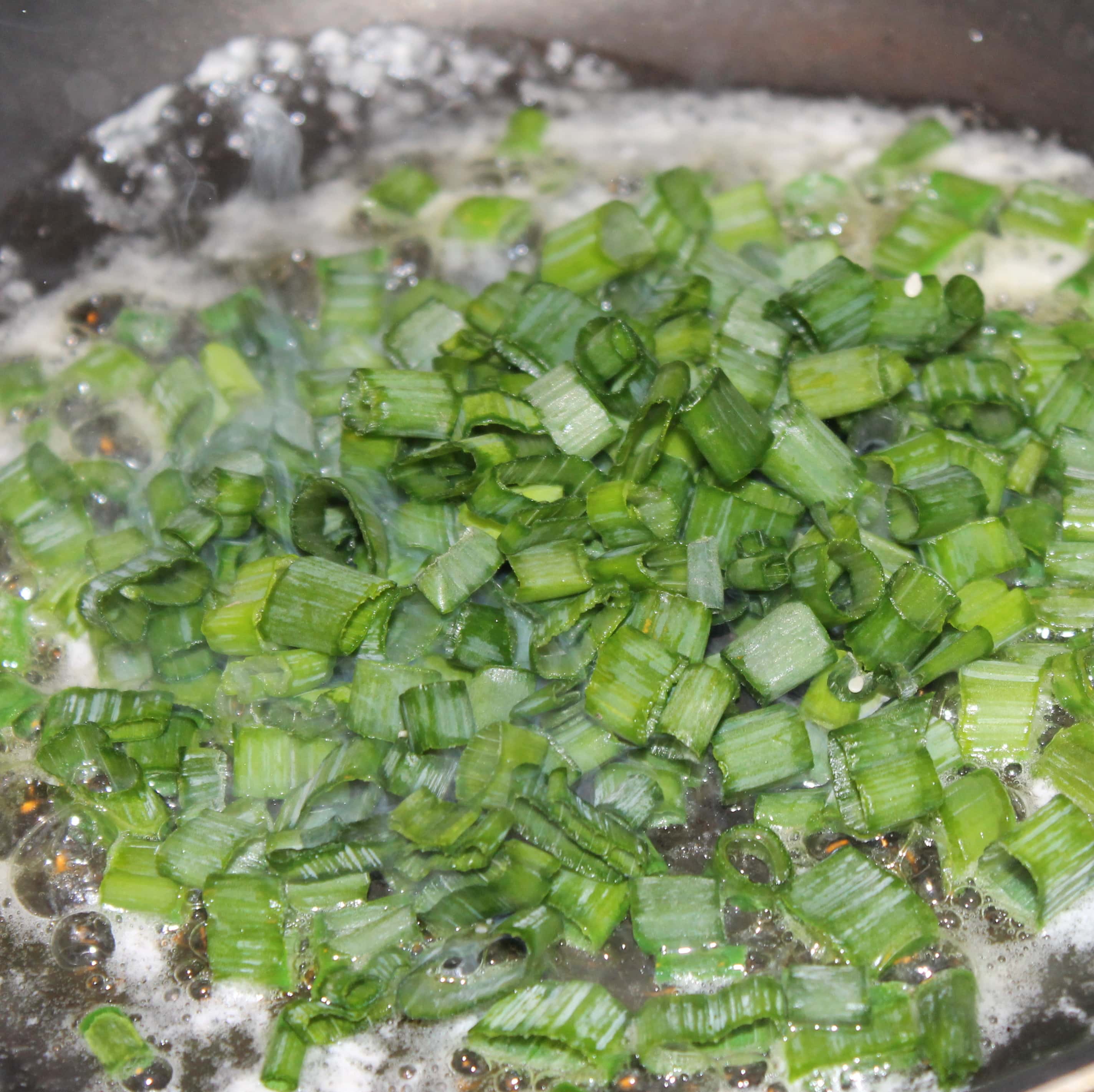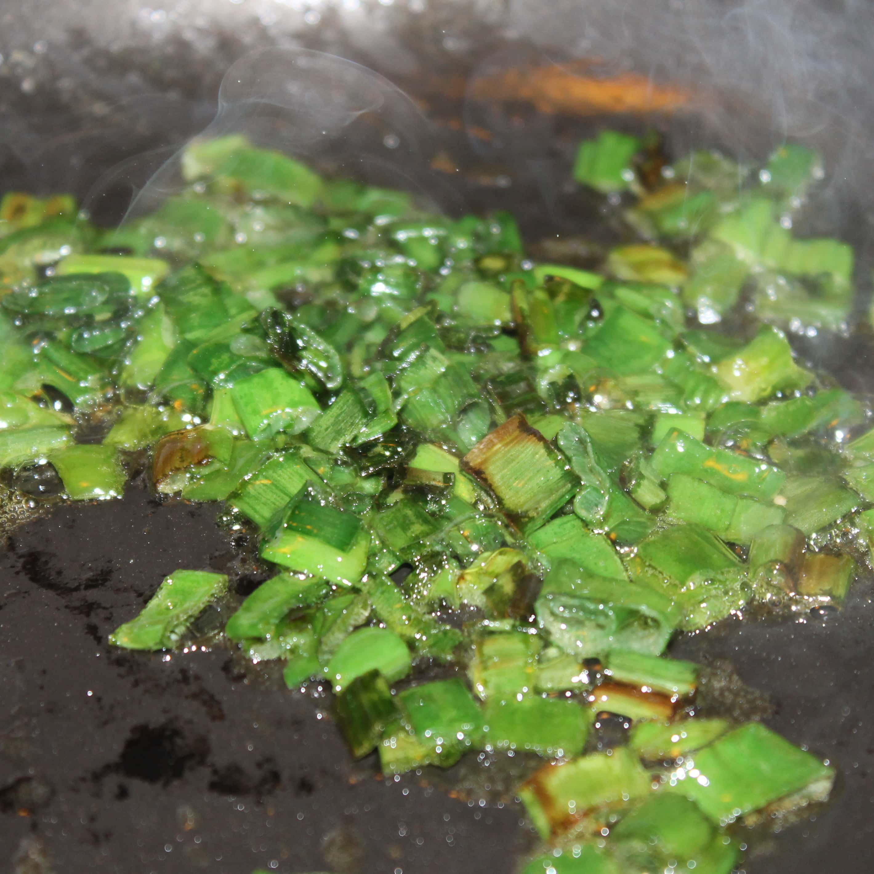 - Add the olive oil to the pan and swirl. Add the green onions and cook for 2 minutes, stirring occasionally.