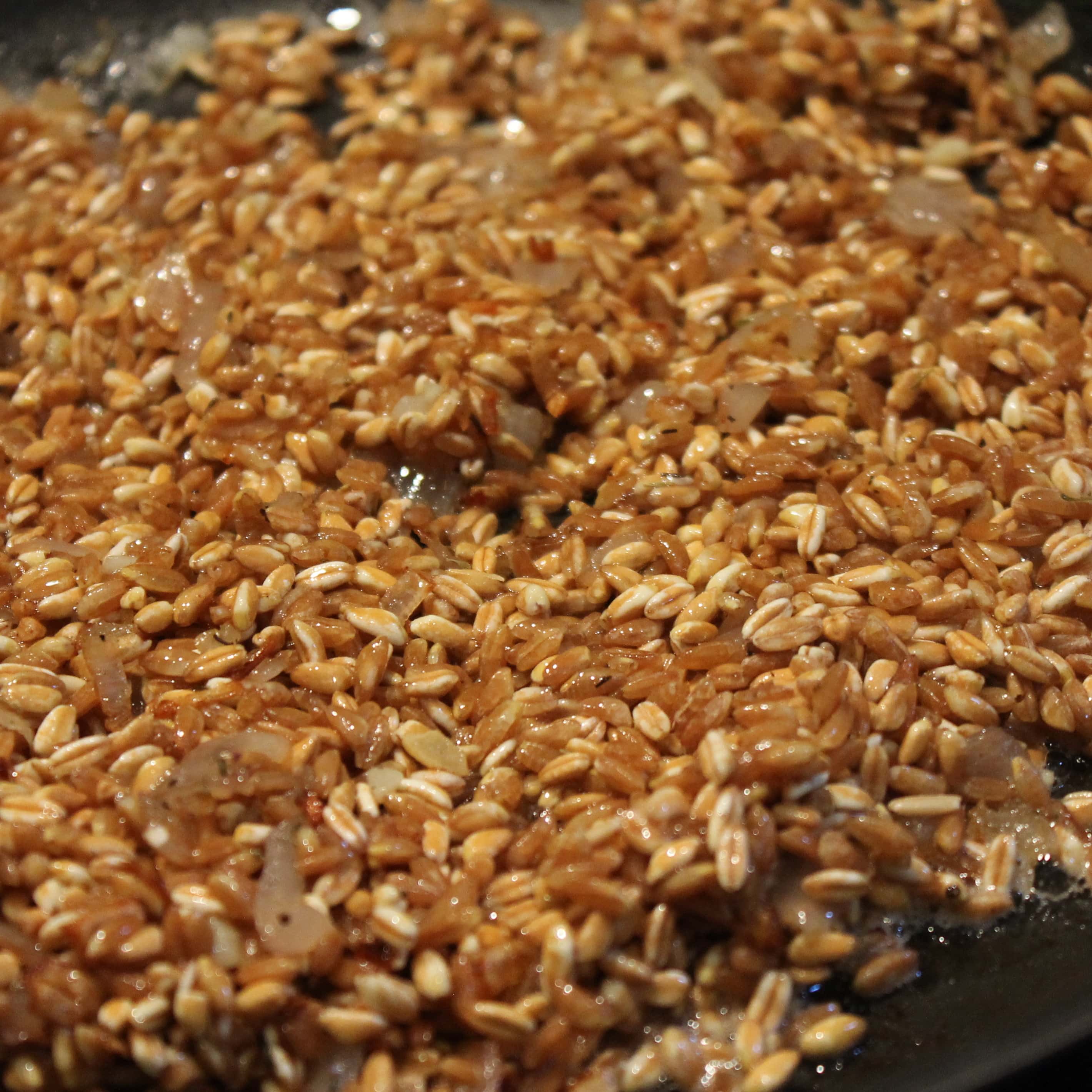 - Add farro and mix to combine. Cook for 2-3 minutes.