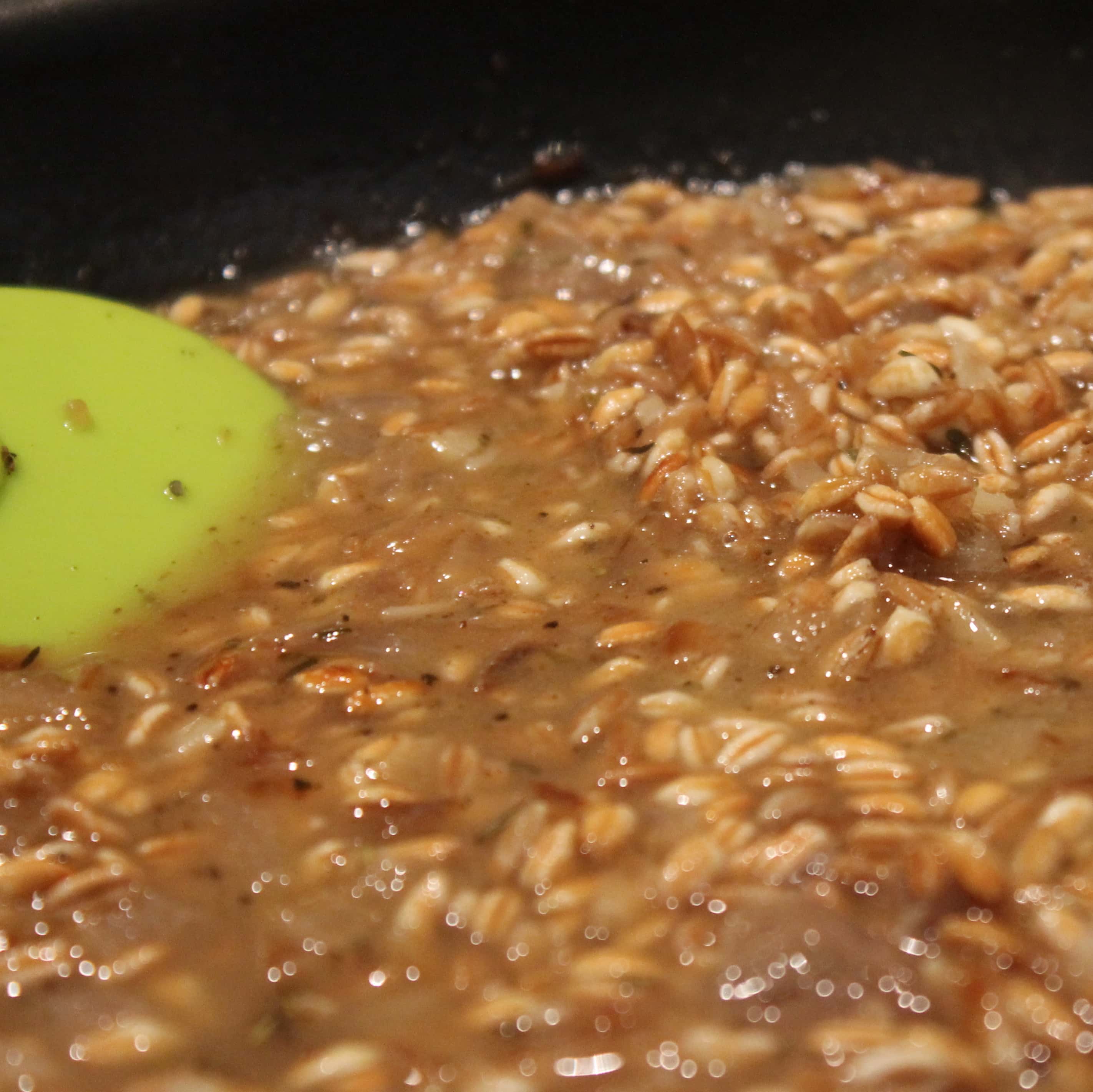 - Add the broth ½ a cup at a time to the farro, stirring frequently, waiting until the broth is mostly absorbed before adding more.