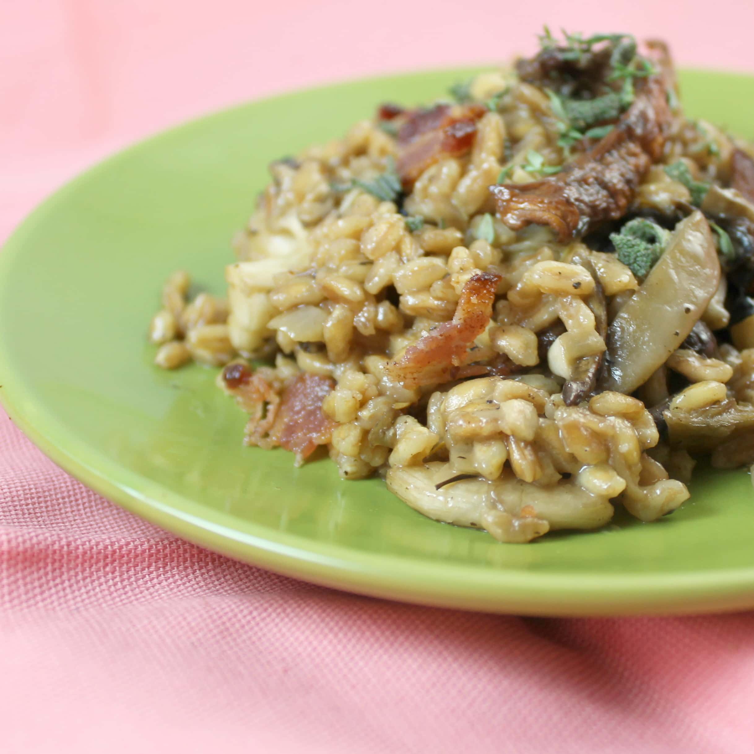 The nutty flavor of farro would be perfect with the earthiness of mushrooms so I decided to make a wild mushroom farro risotto with Tuscan Fields’ Farro Perlato. I added a bit of bacon to really heighten the flavor of the risotto as well.