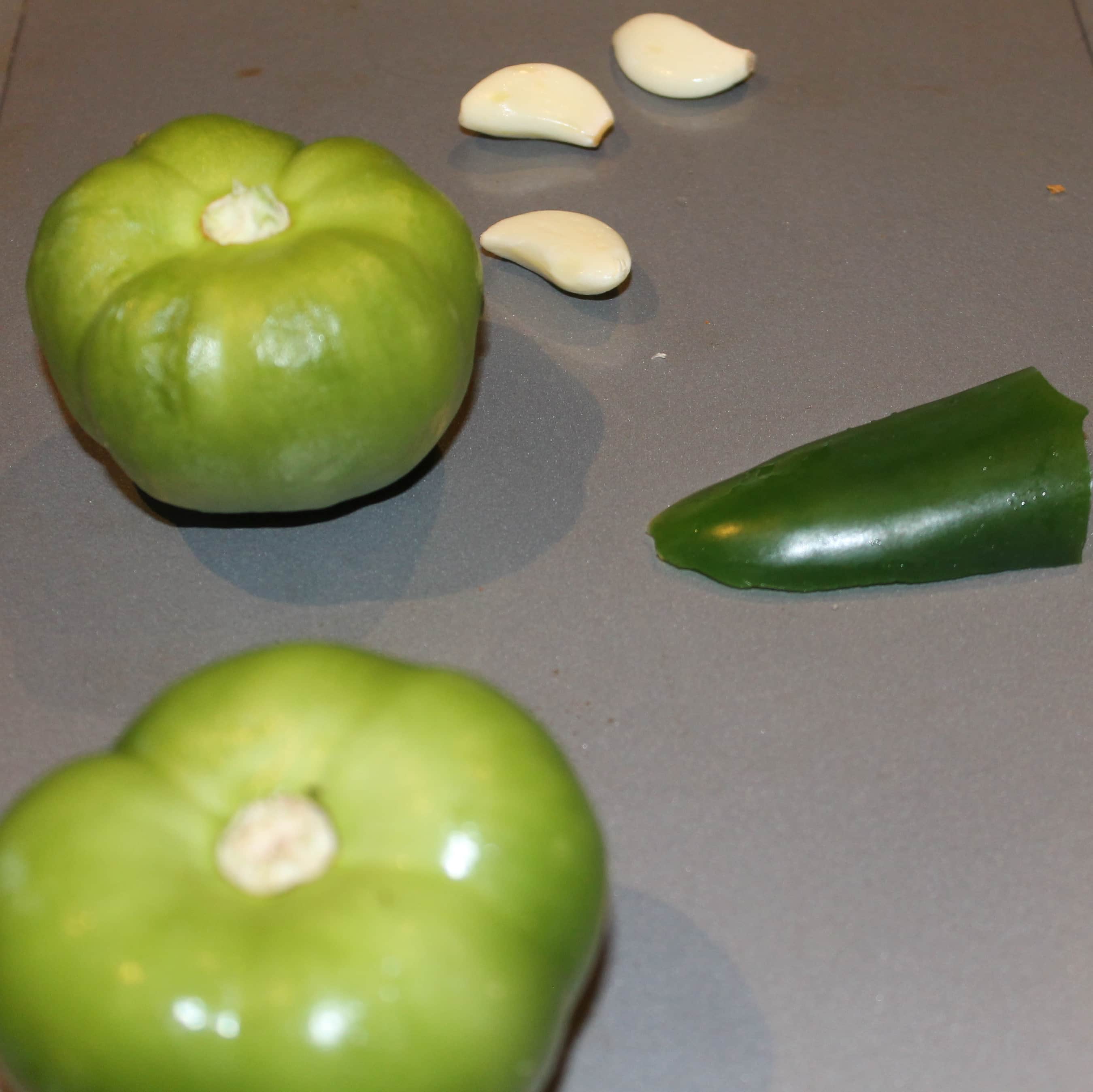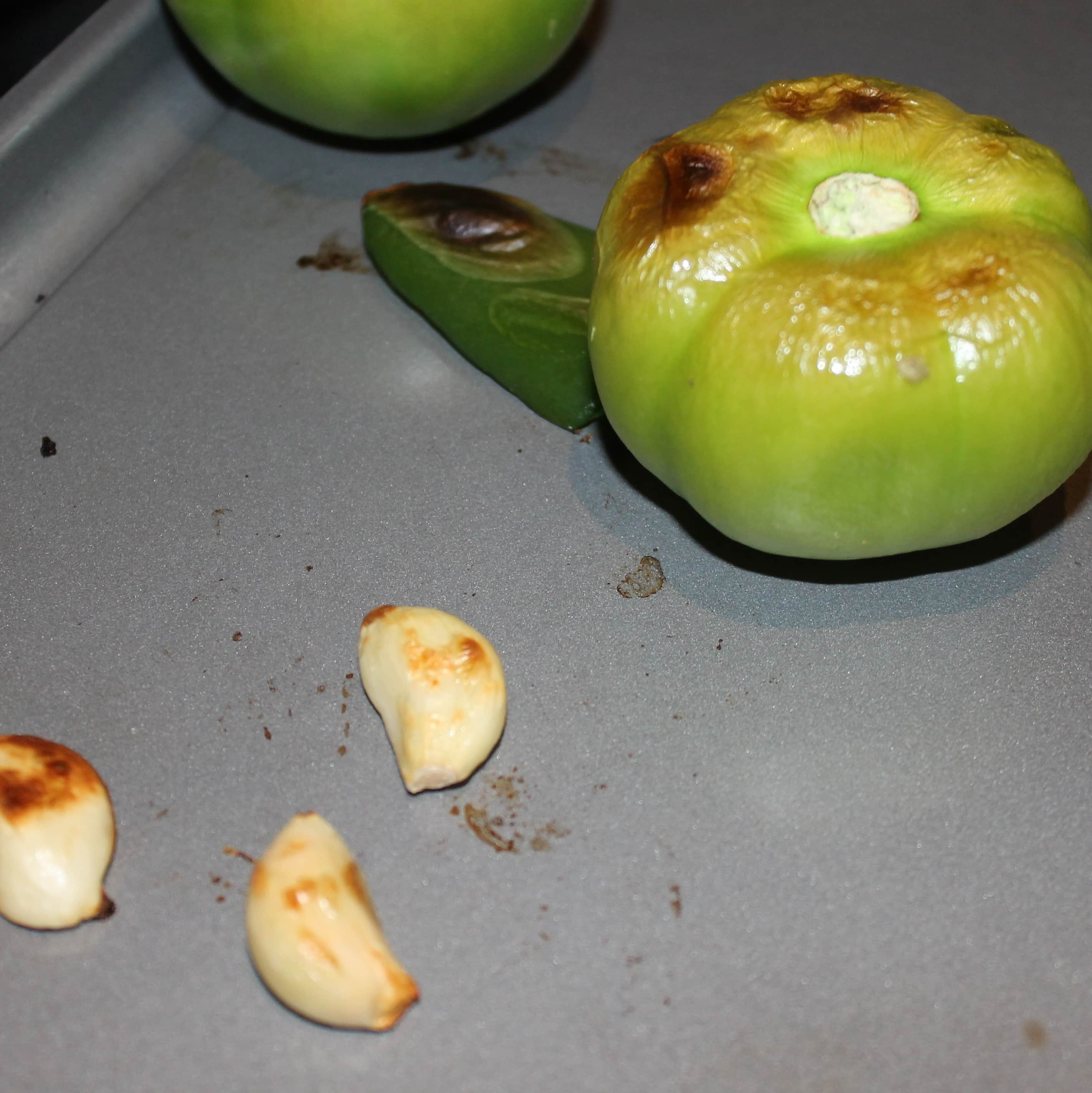 - Preheat your broiler to high. Add the garlic, tomatillos, and jalapeno in a single layer on a cookie sheet.