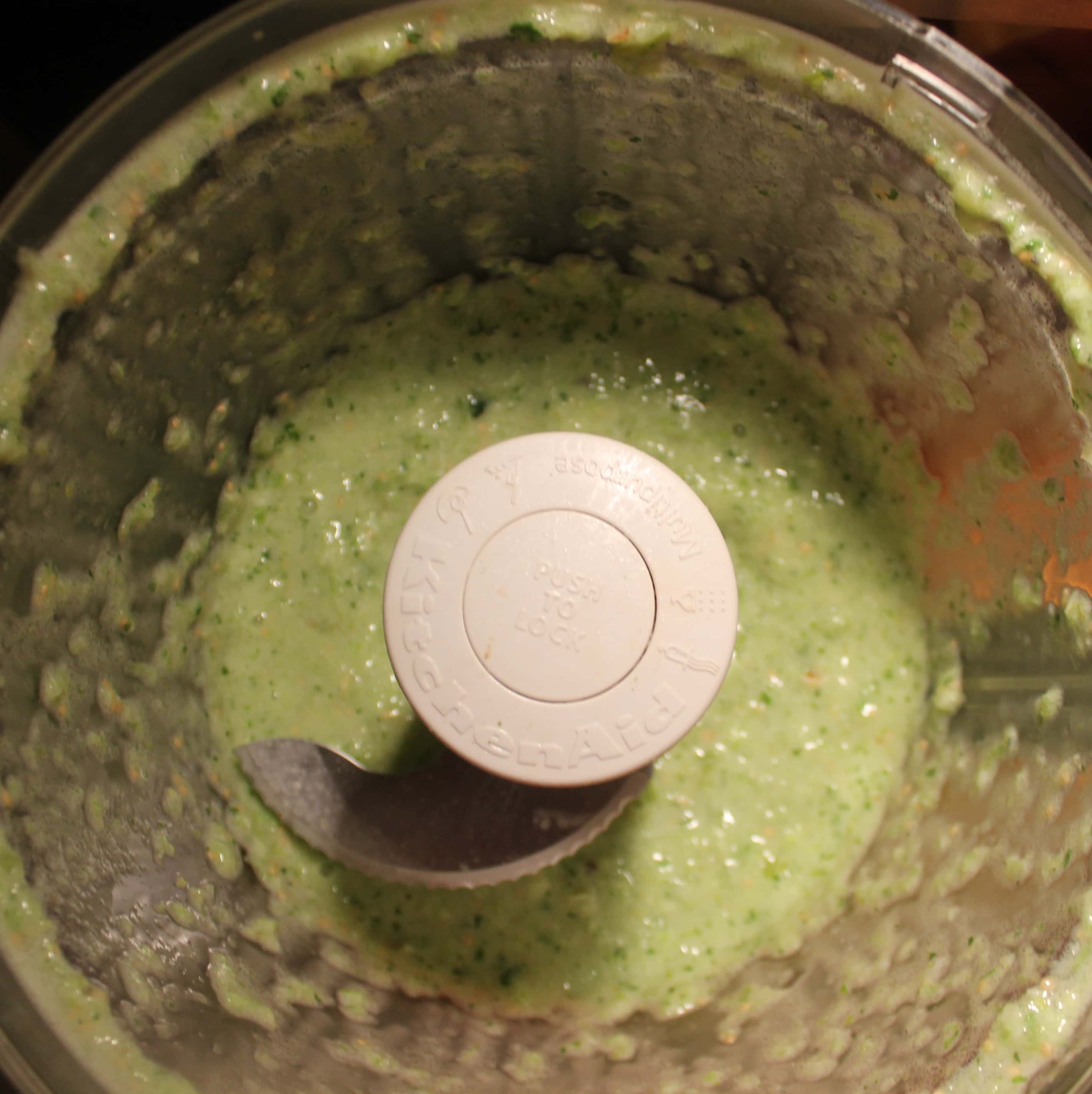 - Add the tomatillo mixture, cilantro stems, mayo, sugar, and 1/8 teaspoon salt in a food processor and blend until smooth.