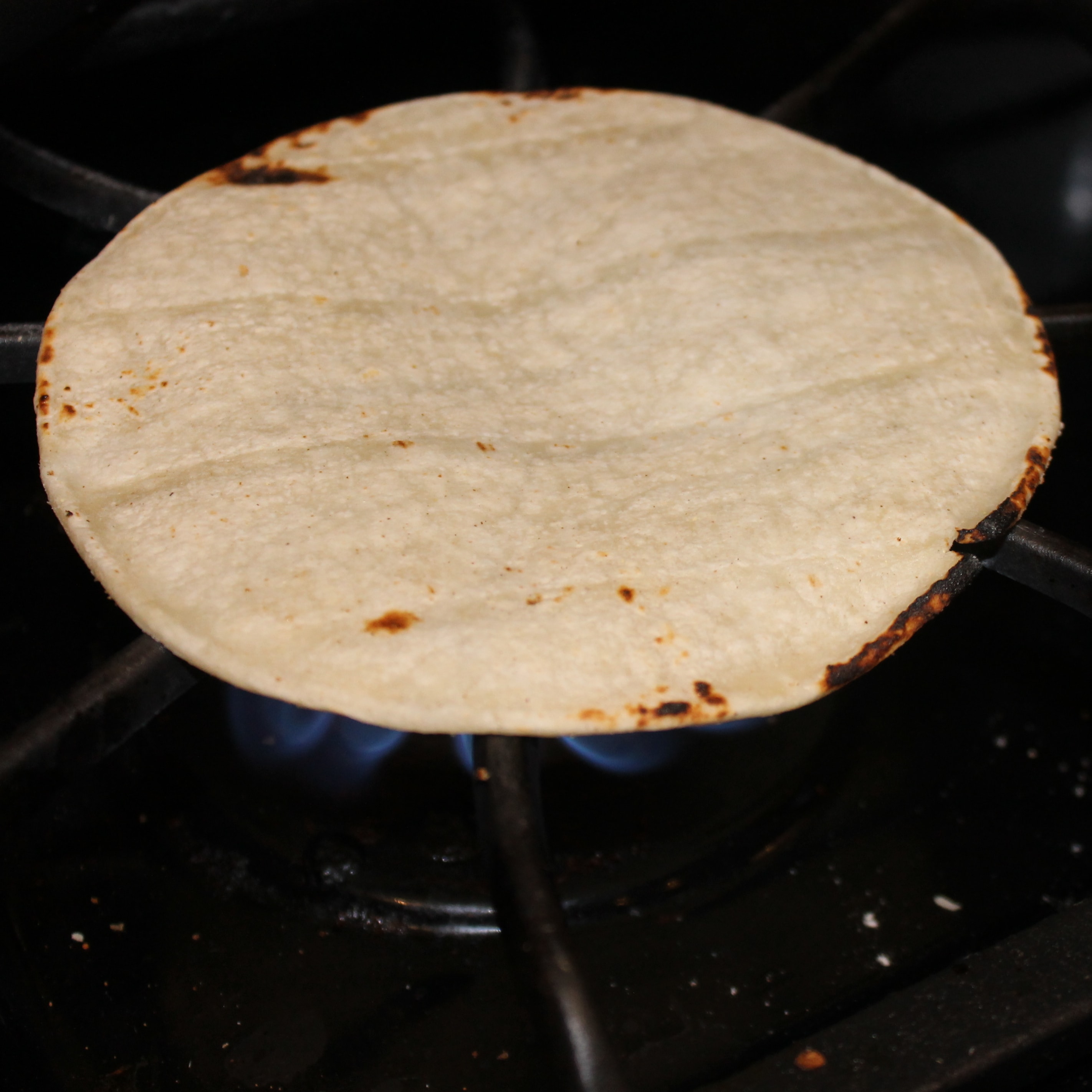- Working with 1 tortilla at a time, heat tortillas over medium-high heat directly on the eye of a burner for about 15 seconds on each side or until lightly charred.