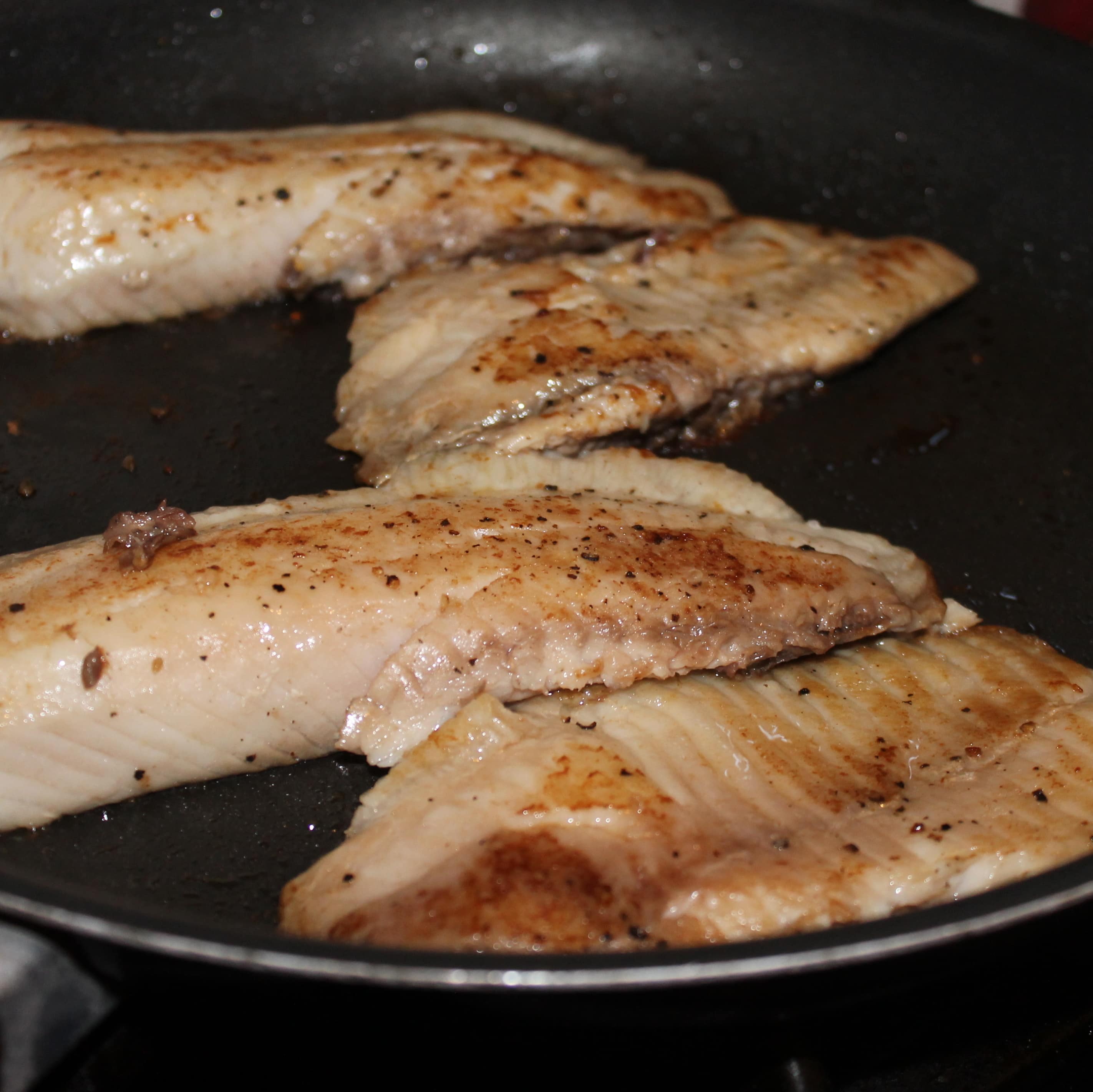 - Heat a large saute pan over medium-high heat. Sprinkle the fish evenly with the remaining 1/4 teaspoon salt and black pepper. Coat the pan with cooking spray and add the fish to the pan. Cook for 2 minutes, turn the fish over, and cook for an additional minute or until cooked through.