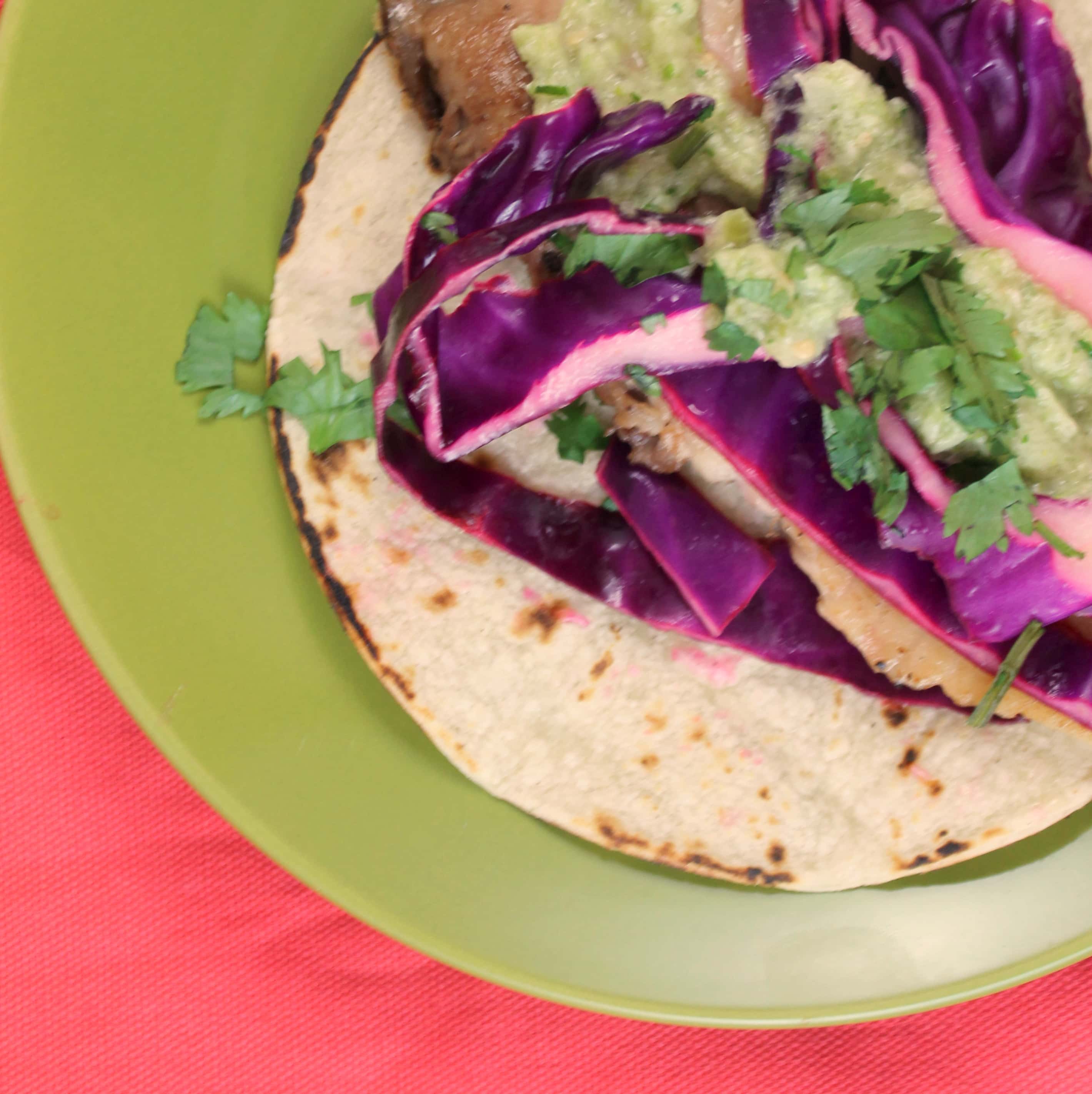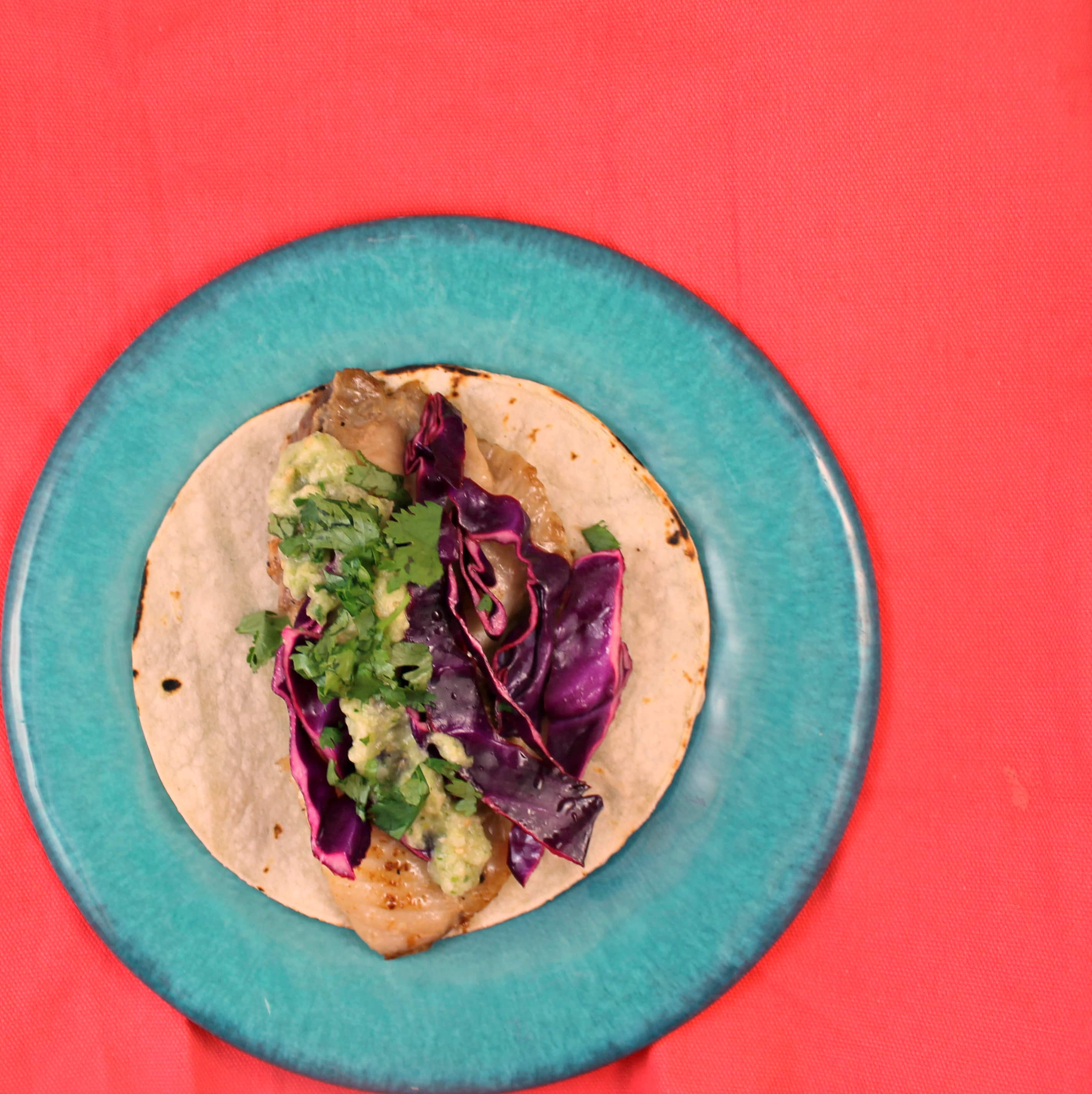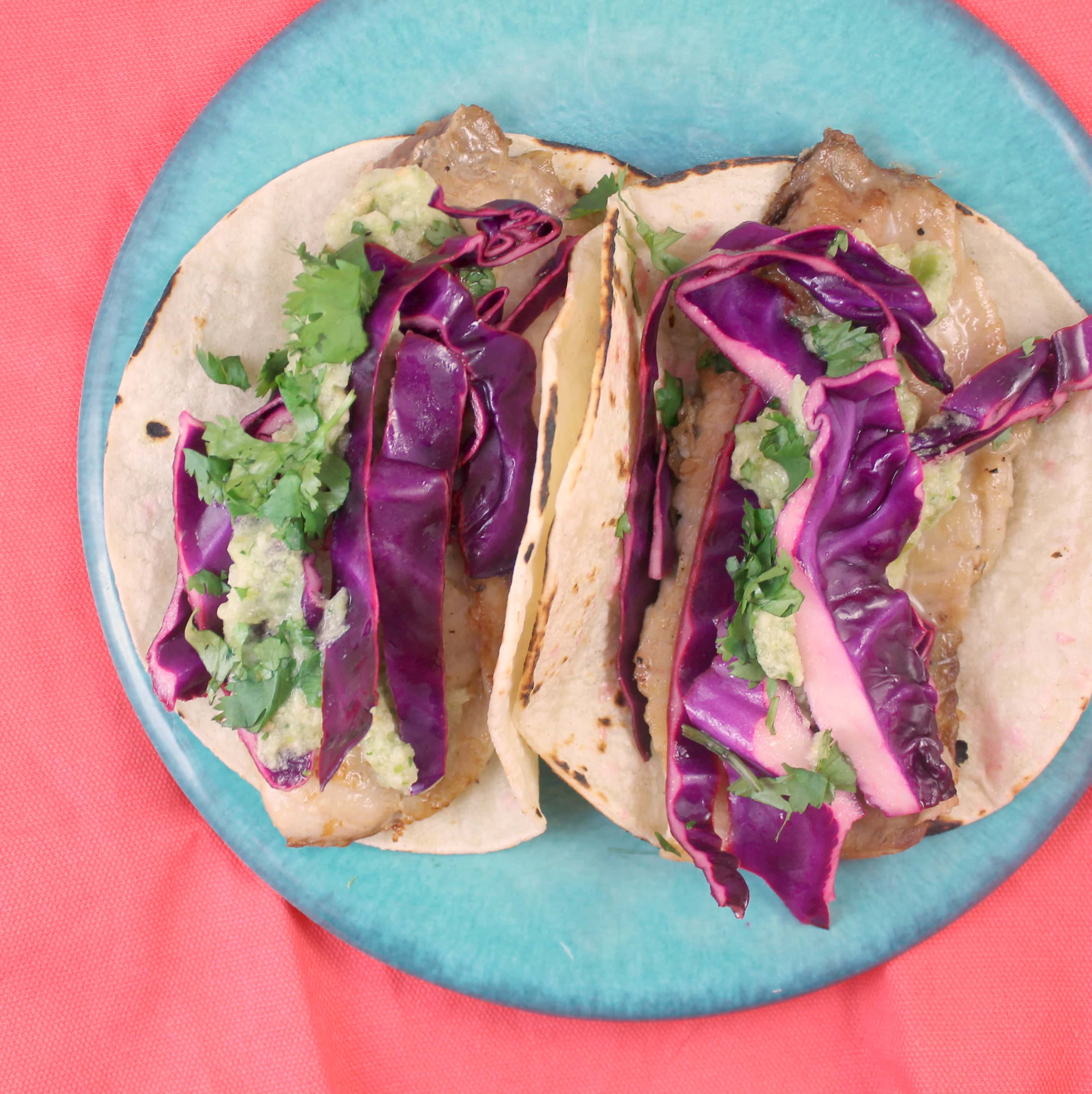 - Arrange half of a tilapia fillet in center of each tortilla; top each with 1/4 cup cabbage mixture, about 1 1/2 tablespoons tomatillo mixture, and about 1 1/2 teaspoons cilantro leaves.