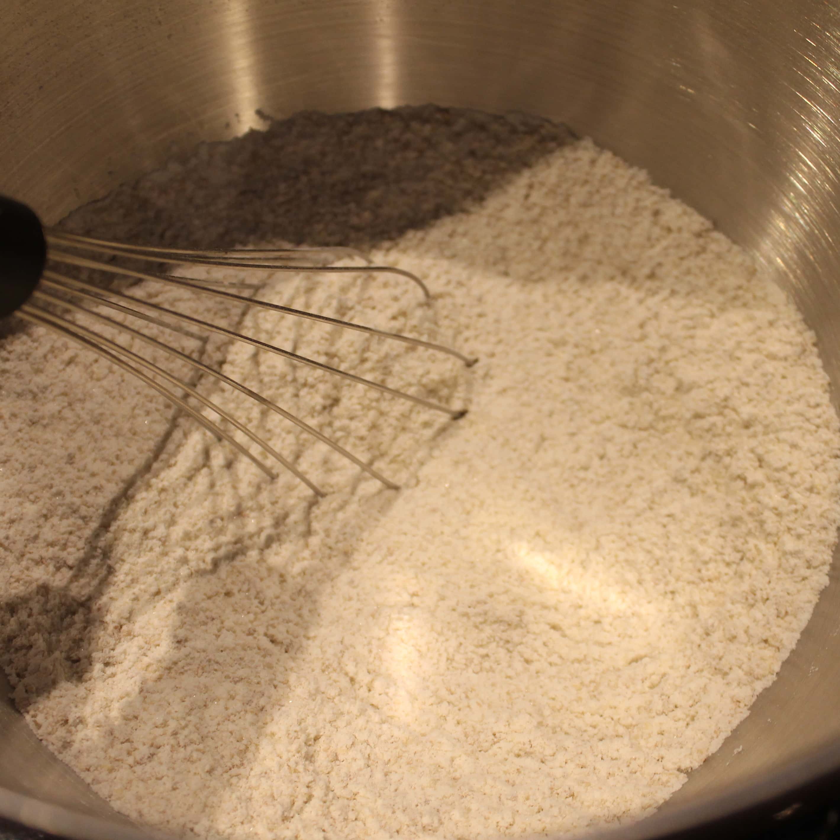 - Add the flour, wheat germ, salt, sugar, and baking soda to a large bowl and whisk to combine.