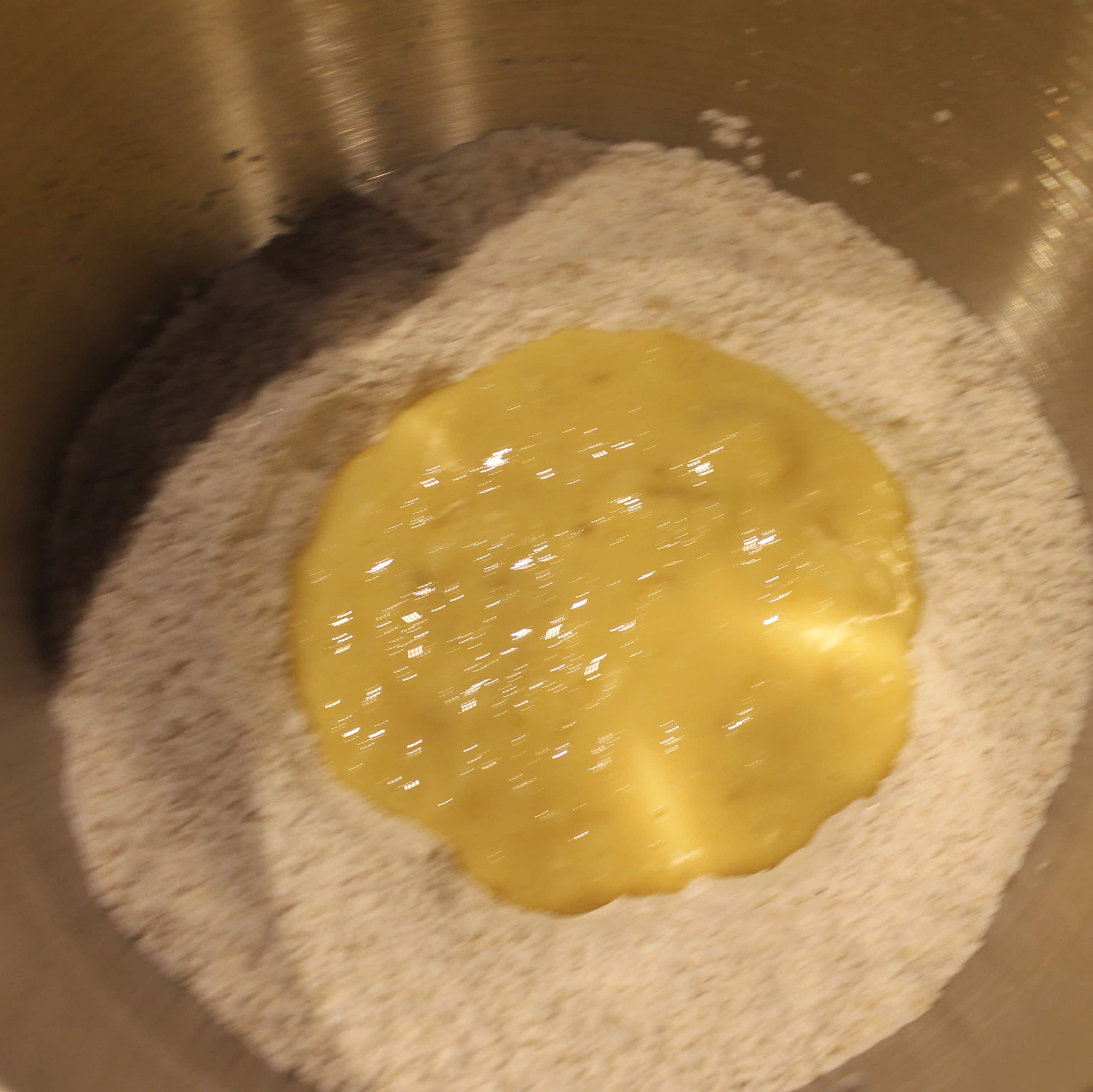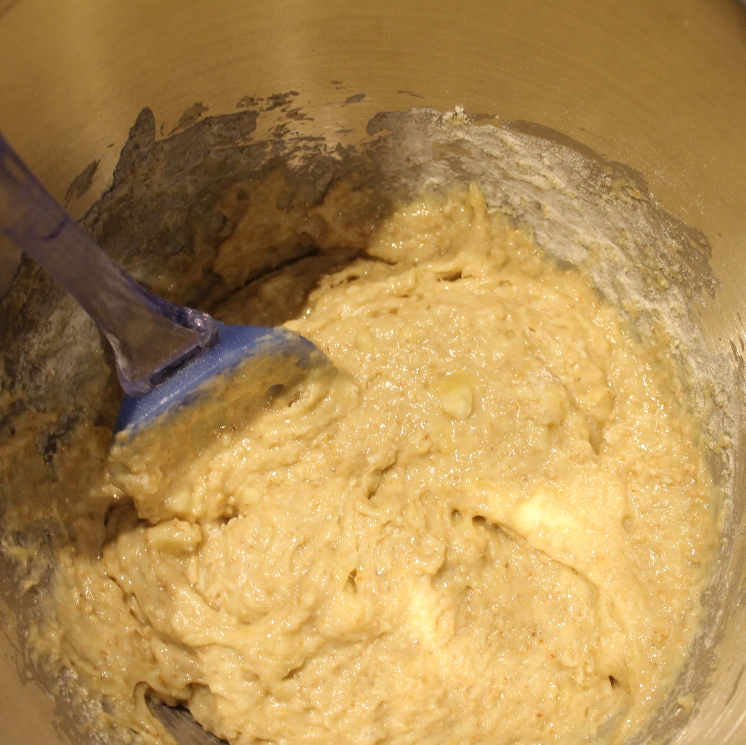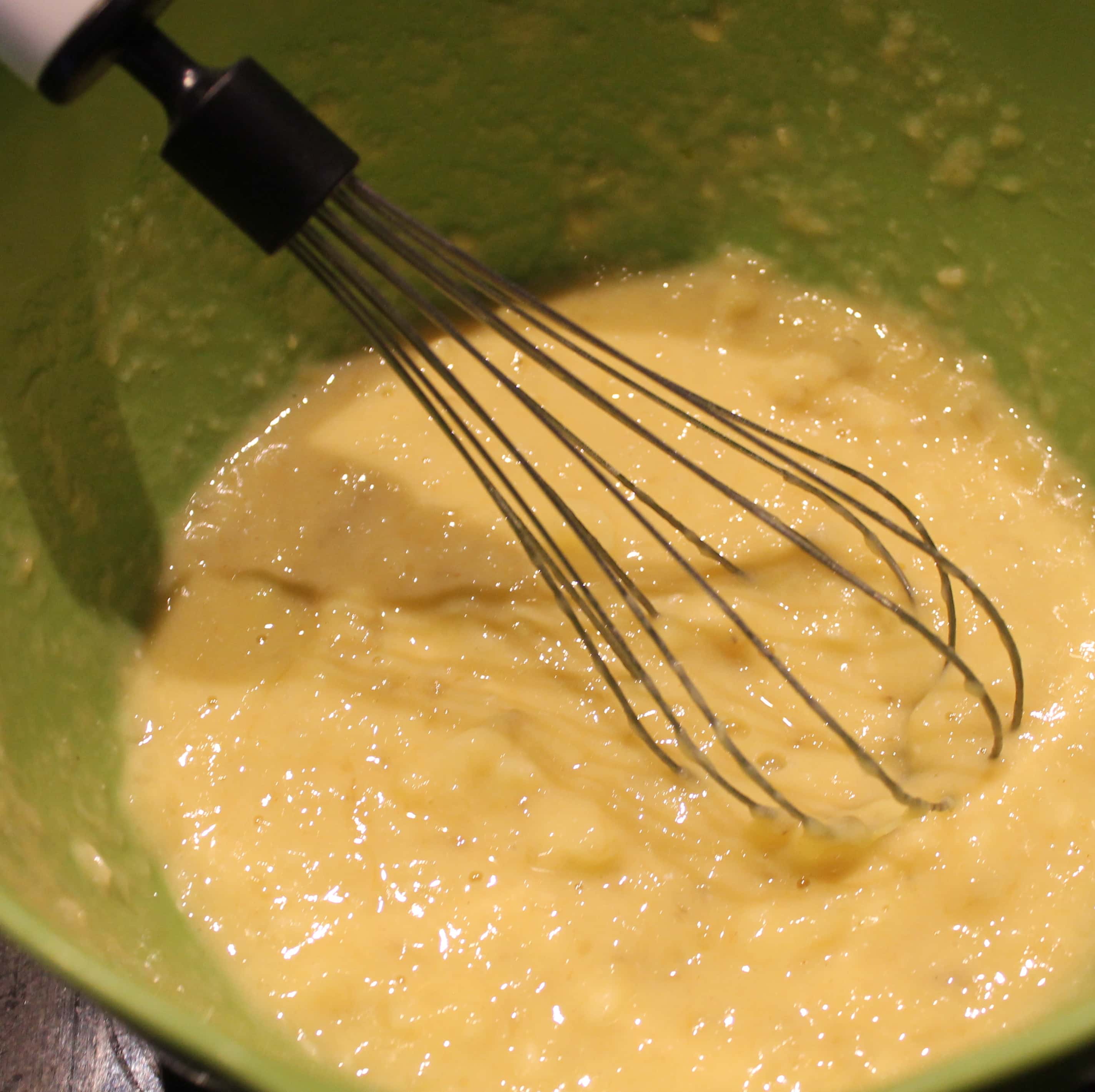 - Form a well in the center of the flour mixture and pour the banana mixture in. Fold the flour mixture into the banana mixture making sure to not overmix.