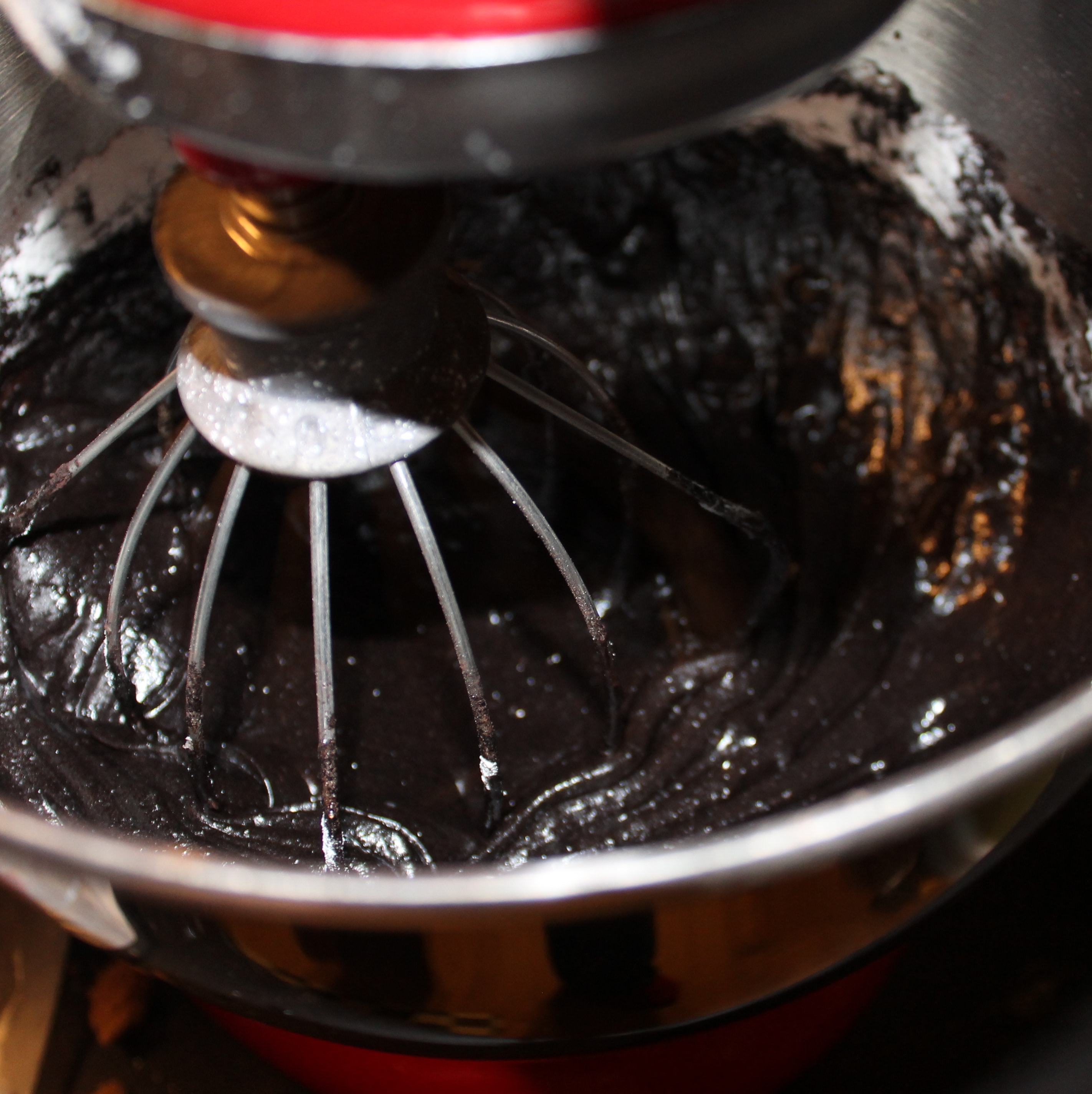 Add the melted butter, dark chocolate cocoa, vanilla, flour, and salt and mix to combine.