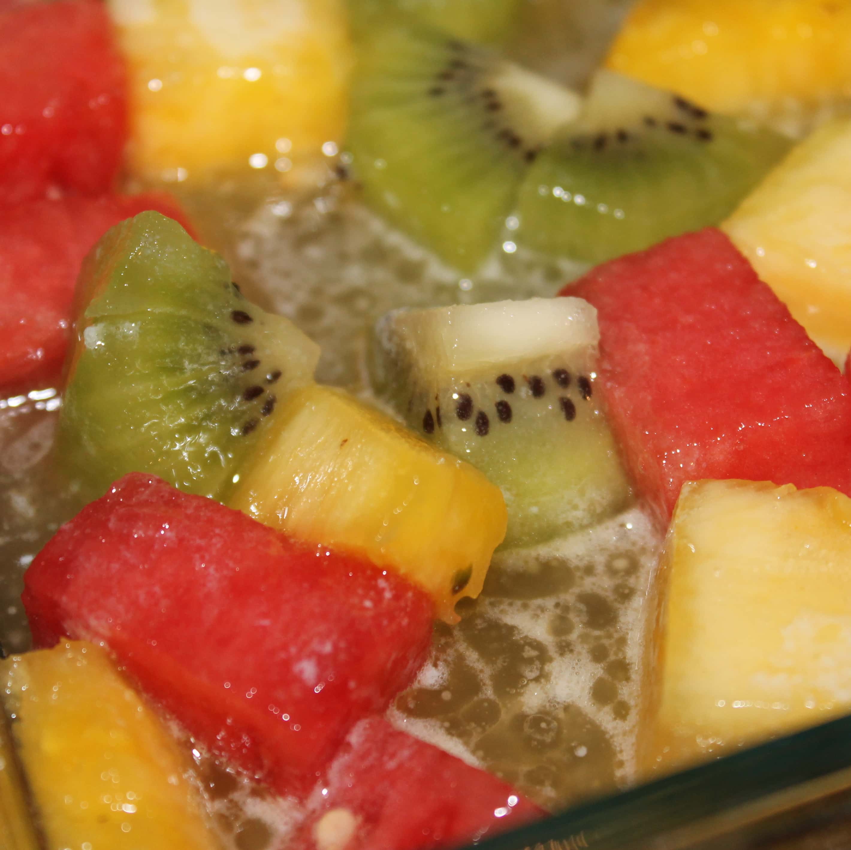- To make the fruit, combine the orange juice, melted butter, and brown sugar. Cut the fruit into bite size pieces and pour the mixture over the fruit.