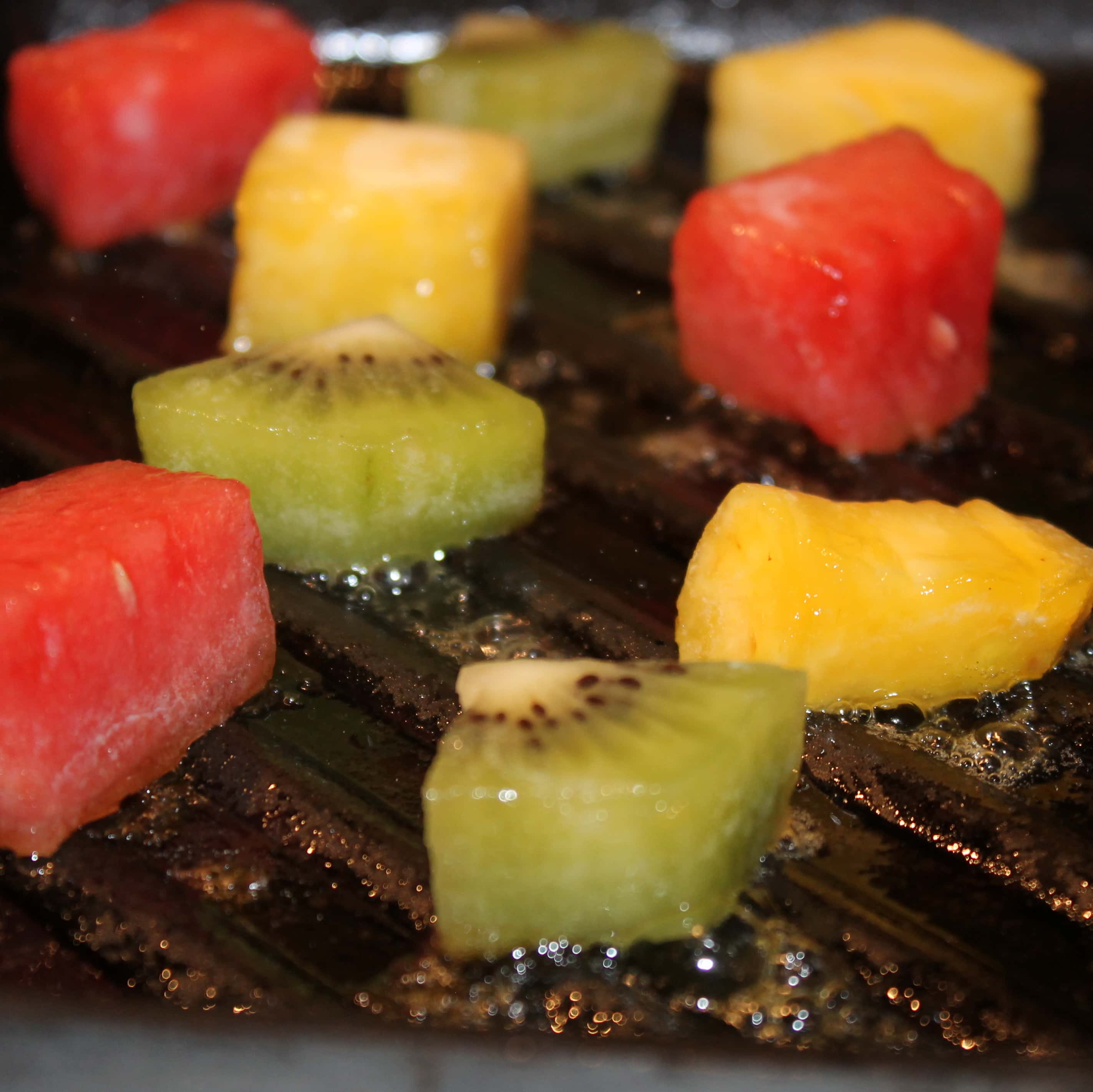 - Heat a grill or grill pan over medium high heat. Speak with cooking spray and add the fruit pieces. (If doing on a normal grill, it probably makes sense to thread the fruit on to skewers before adding to the grill). Grill for 3-4 minutes on each side.