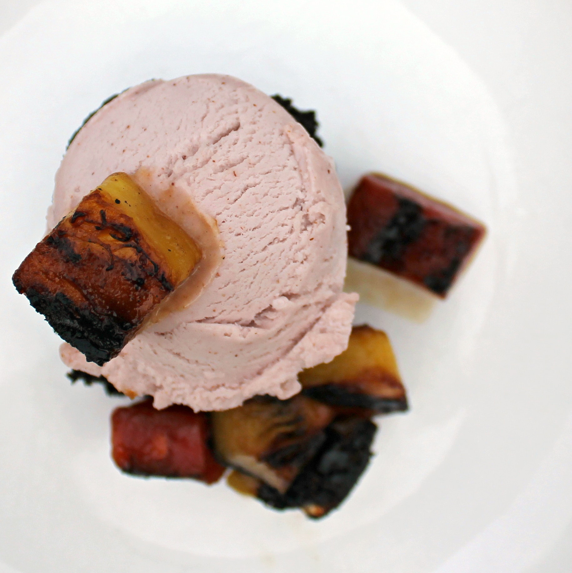 To assemble, add the brownie to a plate. Top with a scoop of ice cream and the grilled fruit.
