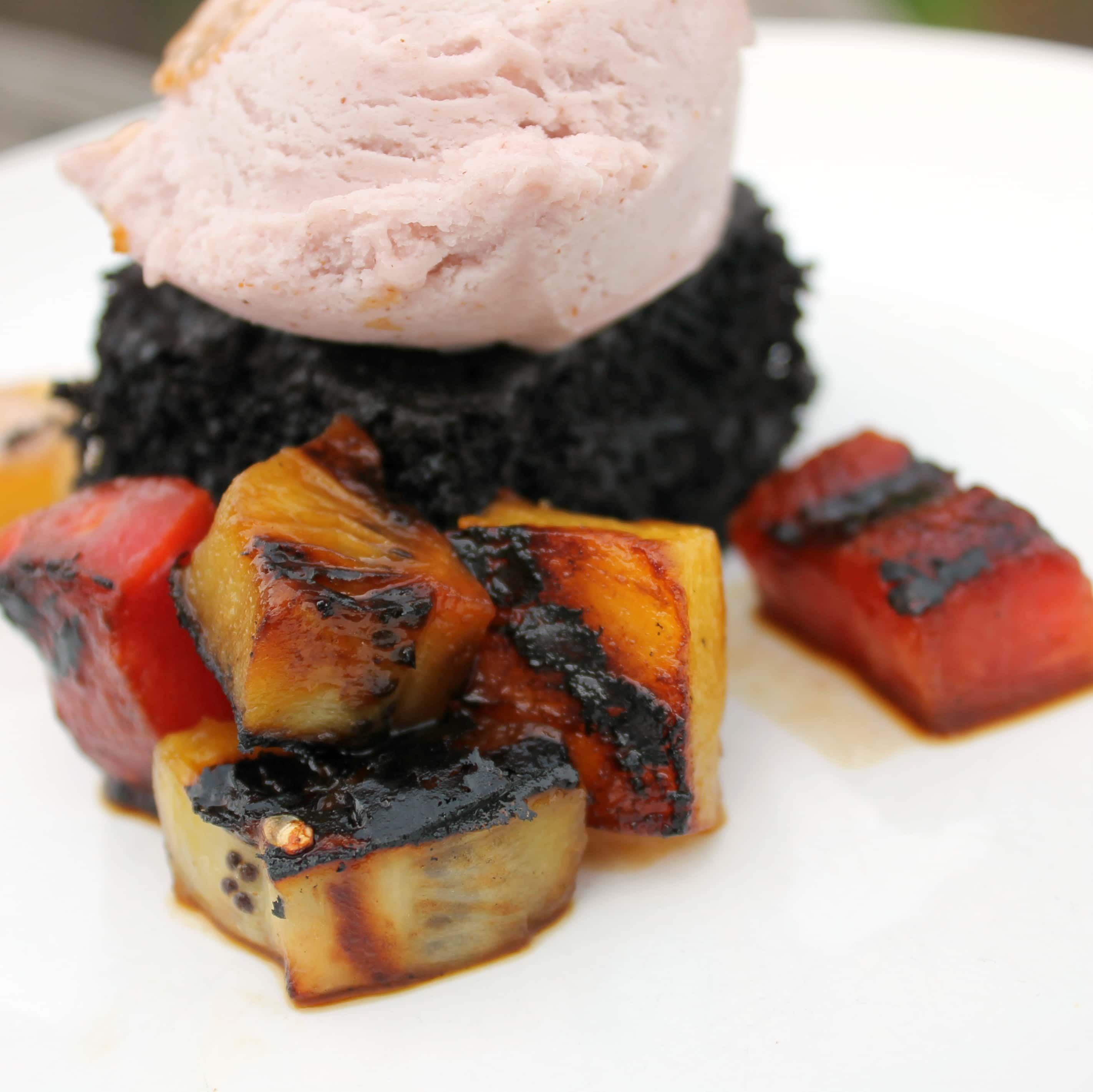 - To assemble, add the brownie to a plate. Top with a scoop of ice cream and the grilled fruit.