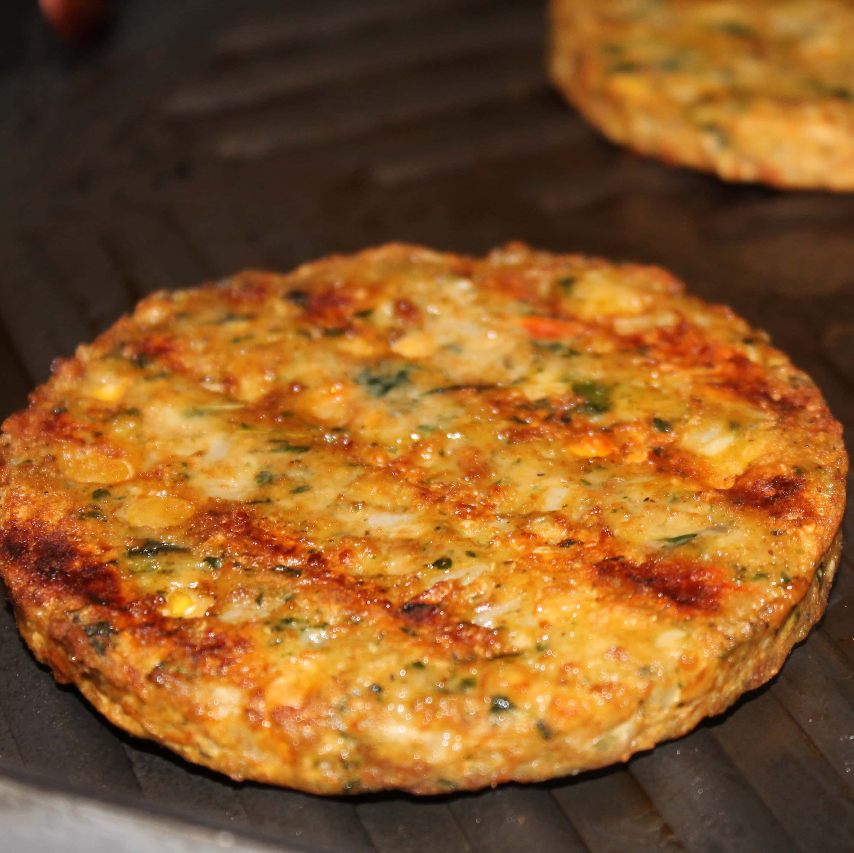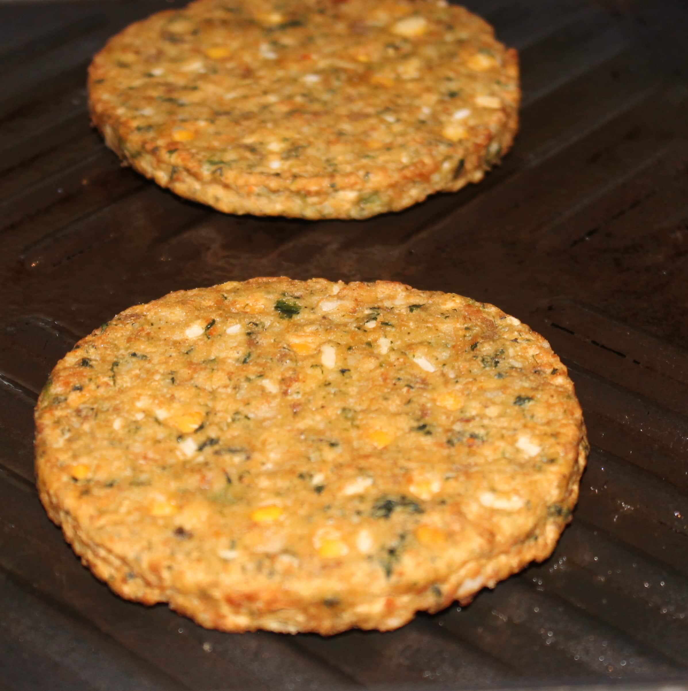 The chickpea burgers also have spinach, Roma tomatoes, and Greek herbs and spices mixed in which deliver a ton of flavor without the fat and calories. These burgers are just 110 calories per burger and have 70% less fat than ground beef.