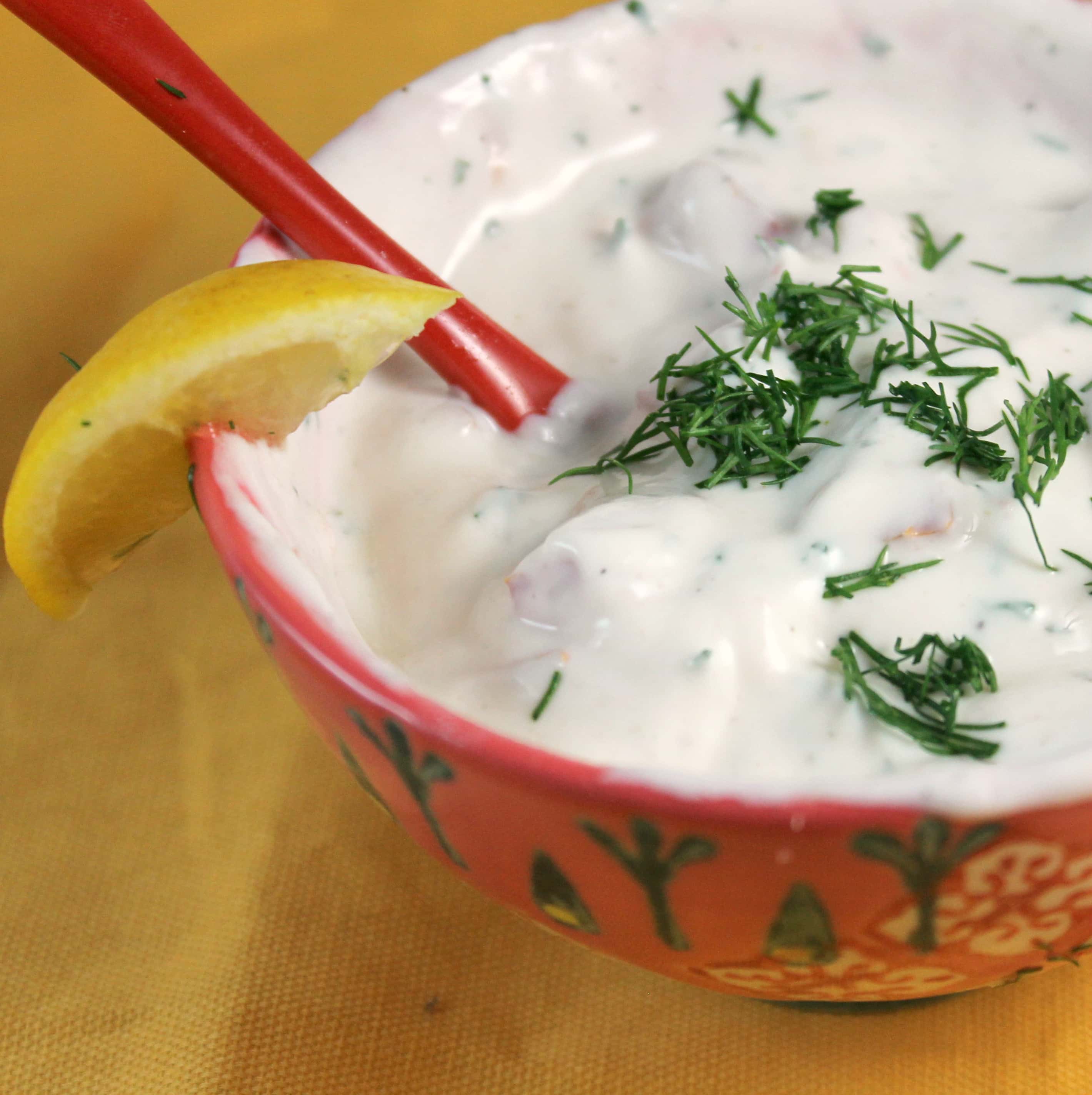 - To make the “Tzatziki,” combine the Greek yogurt, half of the chopped plum tomato, the juice of 1 lemon, 1 teaspoon of a ranch dressing dry packet, and the dill in a bowl.