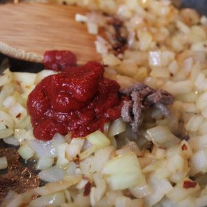 - Add the tomato paste and anchovy paste if using, stirring to combine.