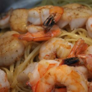 - At this point, if your water is boiling, add the pasta and cook according to package directions for al dente. Before draining, reserve 1/4 cup pasta water, then drain and add the pasta back to the pasta pot. Add the scallops and shrimp to the pasta pot as well.