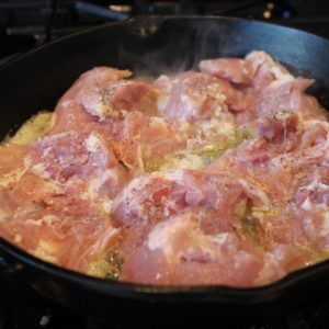 1. Preheat your oven to 400 degrees F. Season your chicken with salt and pepper. Add 2 tablespoons butter to a cast iron skillet over medium high heat. Add the chicken to the skillet skin side down. Cook without moving for 6 to 8 minutes, until the skin is golden brown. Flip the chicken and add the pan to the oven for 10 minutes. Remove from the oven and transfer the chicken to a plate.