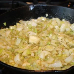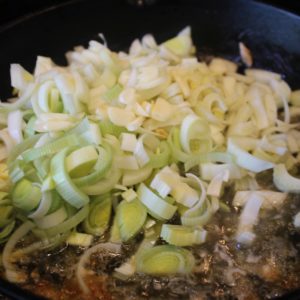Add the fennel and leek to that same skillet and season with salt and pepper. Cook for about 5 minutes, stirring occasionally.