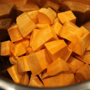 - Cut and dice your sweet potatoes. Add to your pressure cooker with 1 cup water.