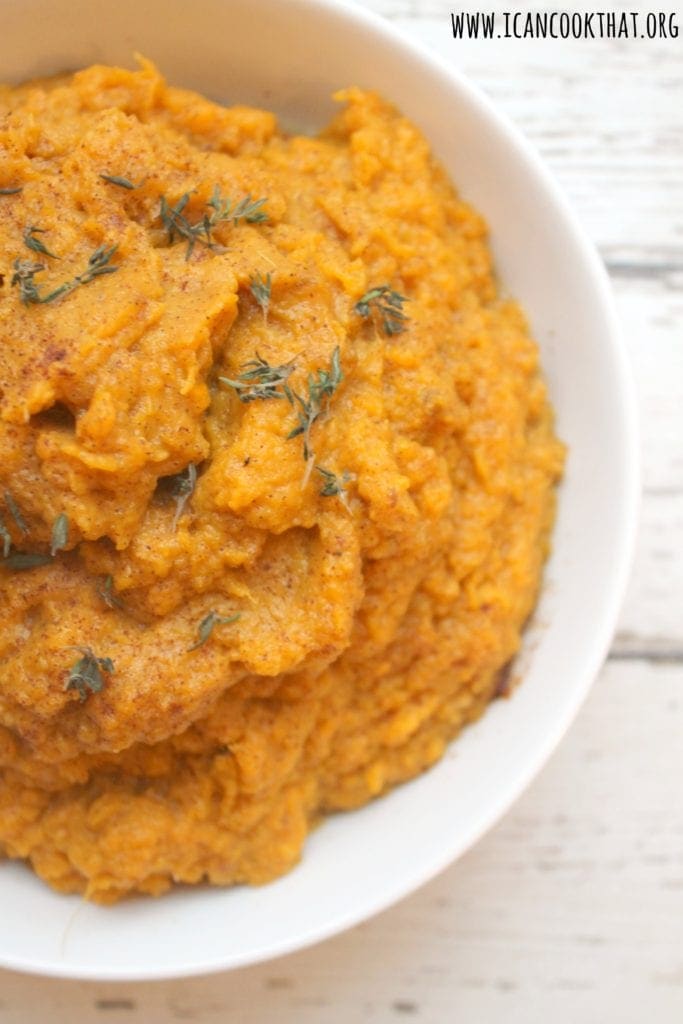 - To serve, scoop the mashed sweet potatoes into a bowl and top with fresh thyme leaves and more cinnamon, if desired.