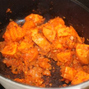 3. Add the sweet potato pieces, cooking until the sweet potato begins to brown, about 3 minutes.
