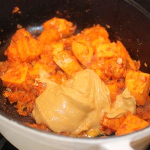 4. Stir in the peanut butter, followed by the vegetable broth, coconut milk, and hot sauce, until fully combined.