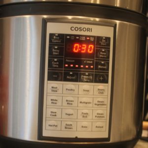 Once the unit has reached optimal cooking pressure (~10 minutes), the unit will beep once and start counting down from 30 minutes. You’ll notice that the pressure release valve rises up during this time. The pressure cooker will beep 3 times to alert you when cooking has finished. It will automatically go on to “keep warm” mode for up to 6 hours.