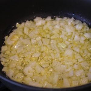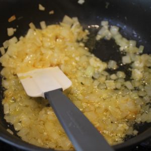 While waiting for the eggplant to cool, add 1/4 cup olive oil to a cast iron pan and heat over medium high heat. Add the onion and cook, stirring occasionally, for about 5 minutes or until softened and fragrant. Add in the garlic and stir to combine, cooking for another minute.