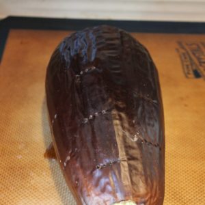 - Cut into the eggplant and scrape the inside into a large bowl and set aside to cool completely, discarding the skin.