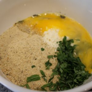 To the large bowl with the eggplant, add in the breadcrumbs, eggs, Pecorino Romano, parsley, 2 tablespoons basil, 1 teaspoon salt, and 1/2 teaspoon pepper, using your hands to combine thoroughly. It will feel really dry at first, but as you work it, it will become more sticky.