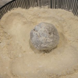 - Add the flour and cornstarch to a shallow bowl, stirring to combine. Line a baking sheet with wax paper or a silicone mat. Roll the eggplant mixture into 20 balls, pressing to tightly compact each ball. Lightly roll each ball in the flour mixture and add to the sheet pan. Drizzle with some olive oil.