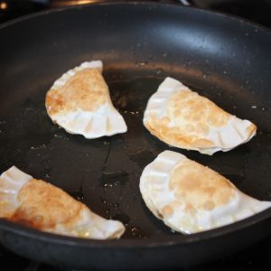 The most difficult/time consuming part of this recipe is finely chopping all of the ingredients. My goodness, do I feel like I need to take a knife skills class after attempting to make this! Despite my incredibly poor knife skills, these came out great! I like the little bit of crunch that pan frying adds, but these would also be tasty boiled or steamed.