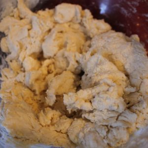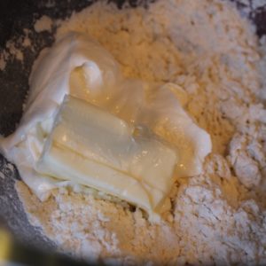 2. Follow with the sour cream and softened butter. The mixture will begin to resemble a dough.