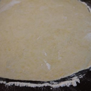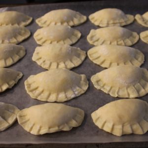6. When you’re ready to fill the pierogis, remove your dough from the fridge and roll out on a large surface to about 1/8″ thickness.