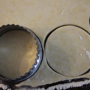 Using a 2″ round cutter, cut out ass many circles of dough as you can. Remove the circles and set aside. Take the scraps, roll it back into a ball, and roll out again to 1/8″ thickness to cut out more dough rounds. Repeat until you have approximately 3 dozen dough rounds.