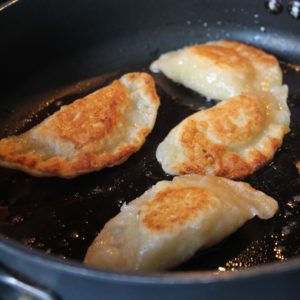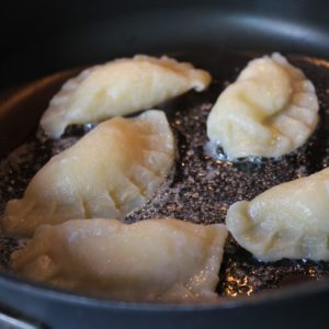 10. If making immediately, heat a large pot of water and bring to a boil. Heavily salt the water and add in 10 pierogis. Cook until the pierogis float, about 3-5 minutes. Repeat, adding 10 pierogis maximum at a time until you’ve cooked as many as you desire. Add the cooked pierogis a few at a time to a saute pan with 1 tablespoon melted butter. Brown on both sides, about 3 minutes on each side.