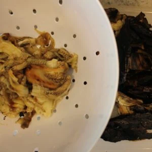 - When the eggplants are cool enough to handle, halve each eggplant and scoop out the flesh into a colander. Let drain for 10 minutes. (You want to remove as much liquid as possible.)