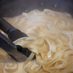 - Add the drained fettuccine to the sauce, tossing to combine as you add it in.