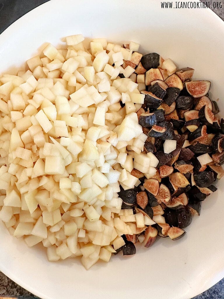 - The most time-consuming part of this recipe is preparing the fruit. Peel and chop your pears and add to a large non-metal bowl with the chopped mission figs.
