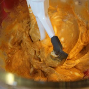 - Add the butter and pumpkin puree to a large bowl, and beat to combine.