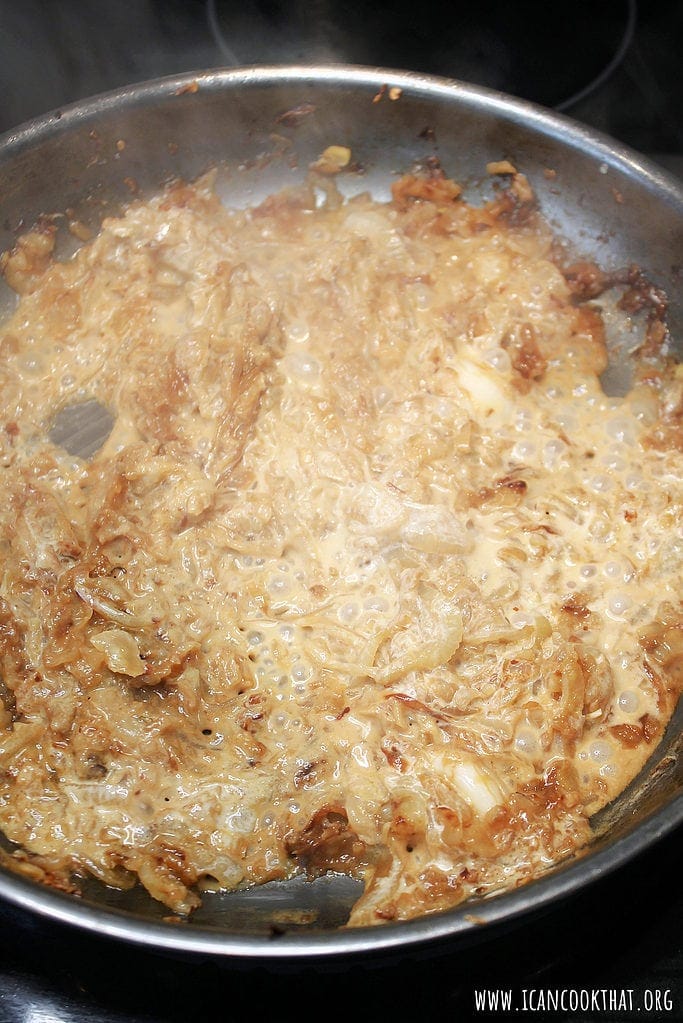- When the mixture is caramelized, add in the crushed garlic and stir in the white wine. Increase the heat to medium and cook until the wine has almost evaporated, about 3 to 5 minutes. Add in the heavy cream and cook for 5 minutes.