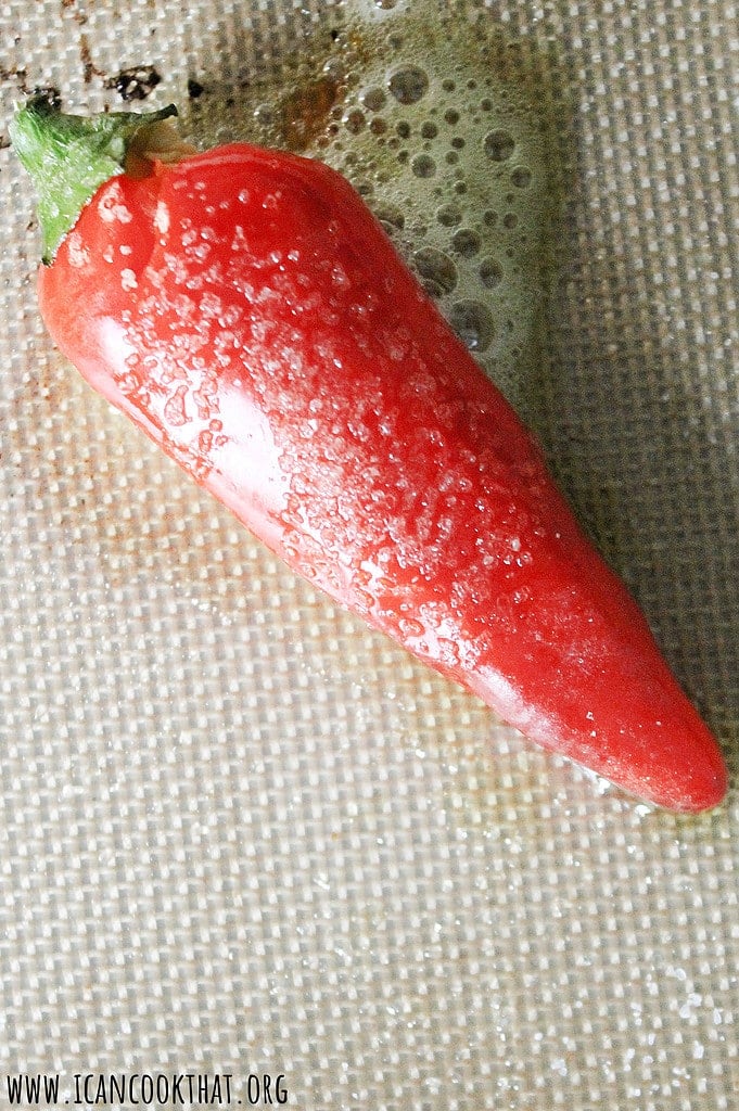 Start by roasting your pepper in the oven. Preheat your oven to 400 degrees F. Add the fresno pepper to a cookie sheet and drizzle with 1/2 tablespoon olive oil. Season with 1/2 teaspoon salt.