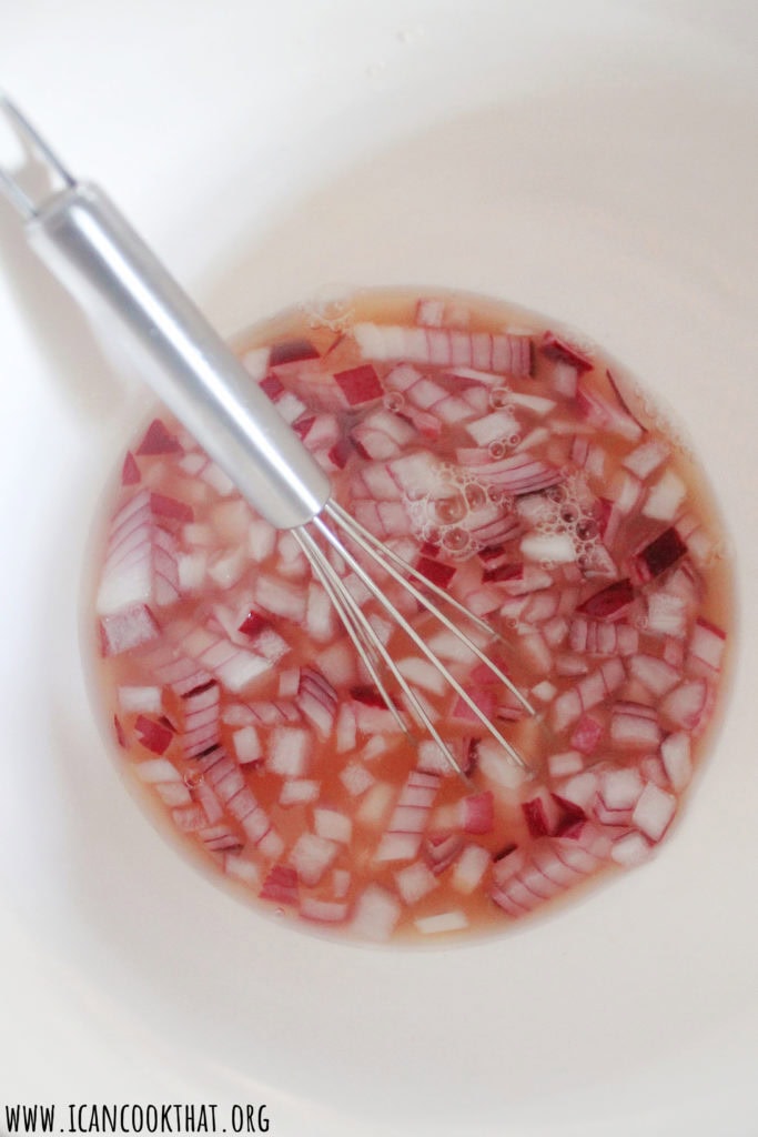 In another small bowl, add the red onion, lime juice, orange juice, and remaining 1/2 teaspoon salt, whisking until the salt has dissolved in the mixture.