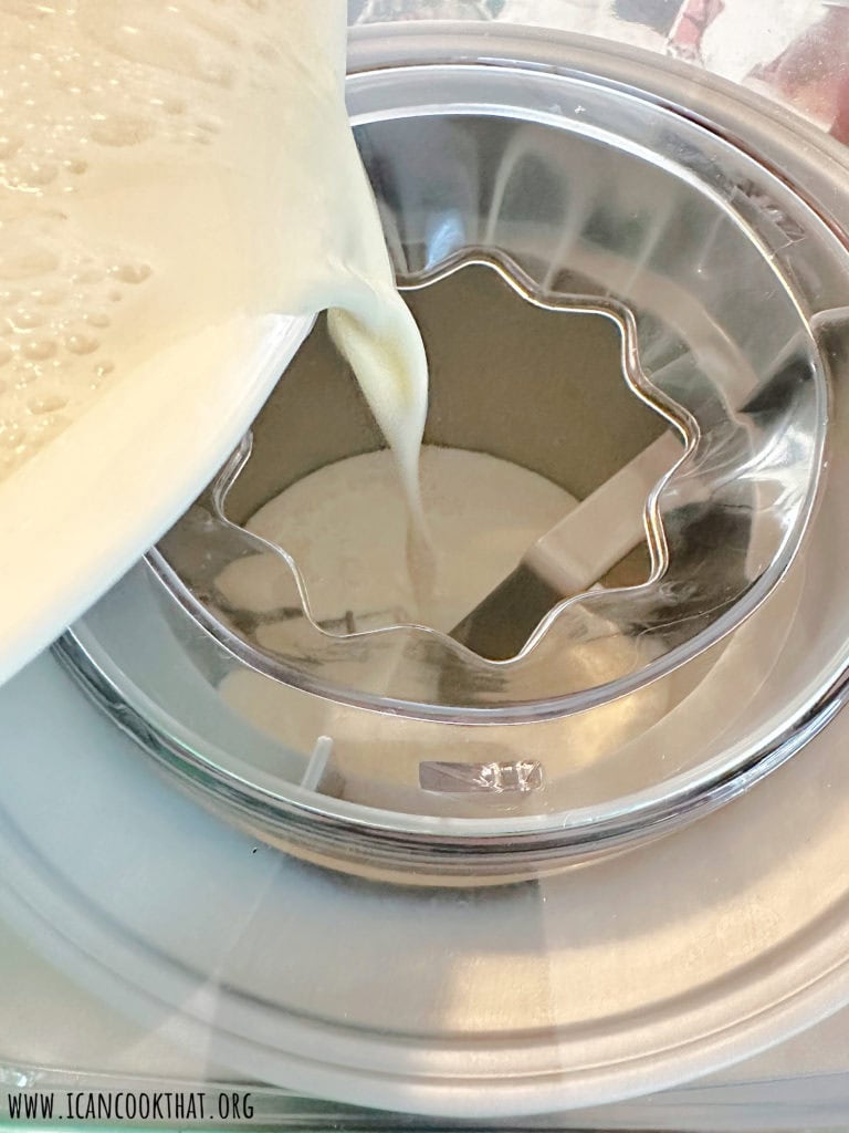 The next day, remove the mixture from your fridge and your ice cream bowl from your freezer. Add the ice cream bowl to the ice cream maker and pour in the cream mixture.