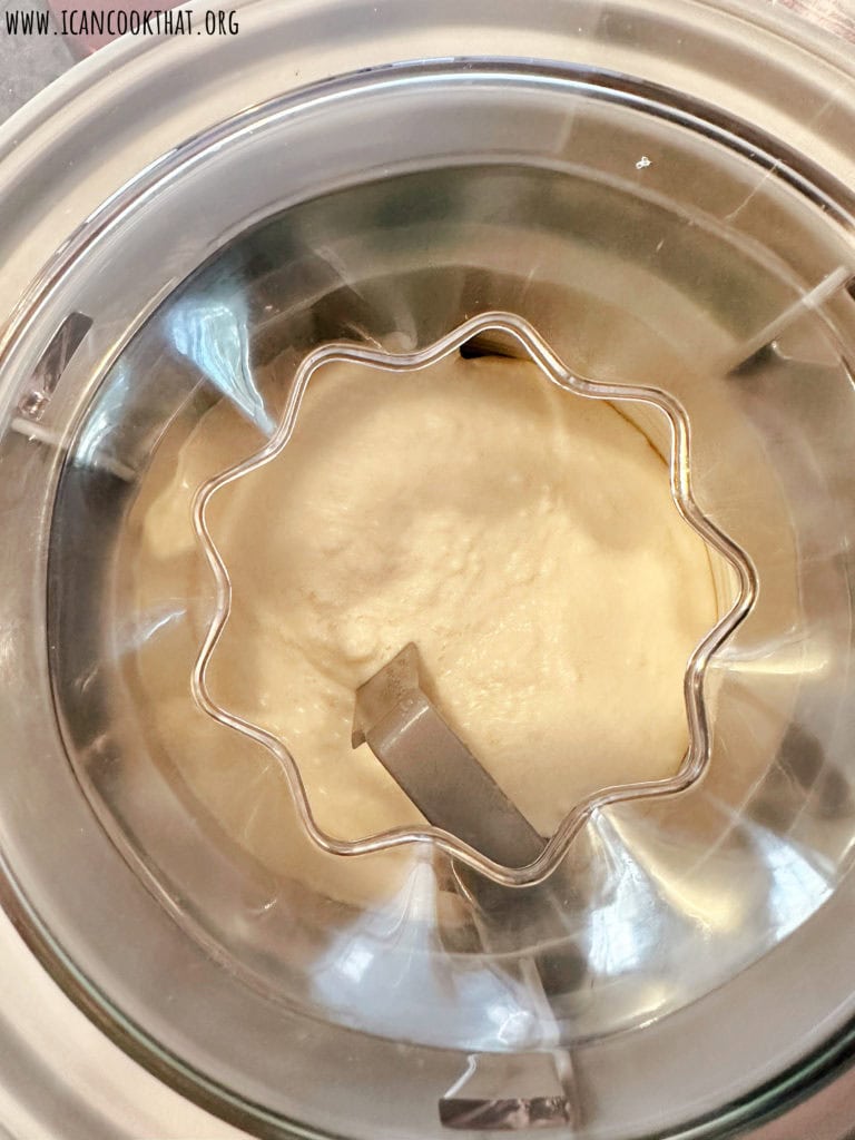 I let the base chill in the fridge overnight. Maybe I didn’t use enough salt to the ice or something, because it took about an hour to thicken enough to add the cookies. And then after 5 hours in the freezer, it was still pretty soft in the middle of the canister. But it was darn tasty.