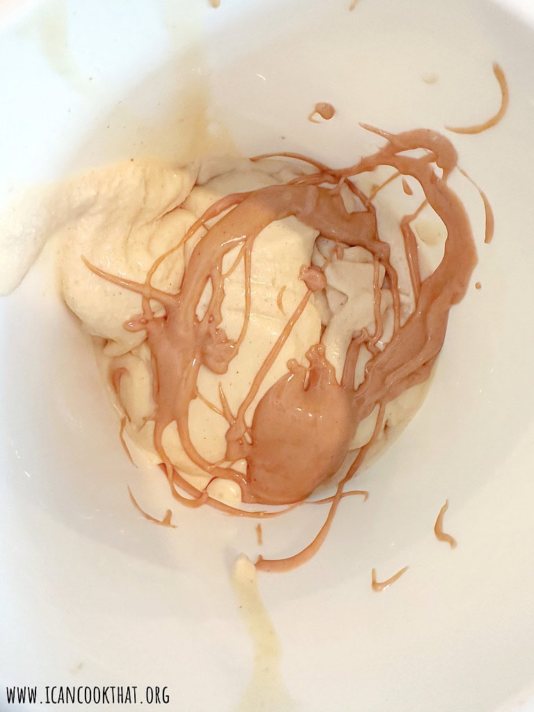• Once the ice cream is ready, as you scoop the ice cream into a freezer-safe container, drizzle in some of the peanut butter in between layers.