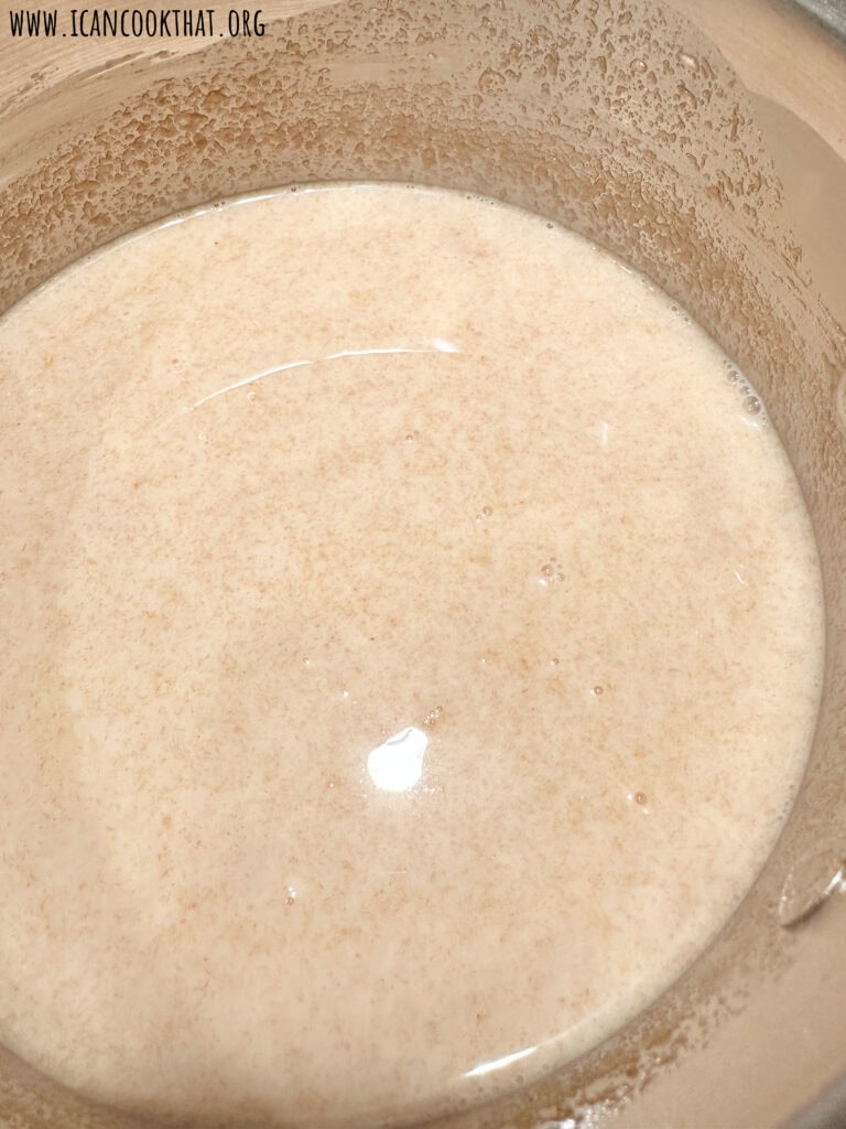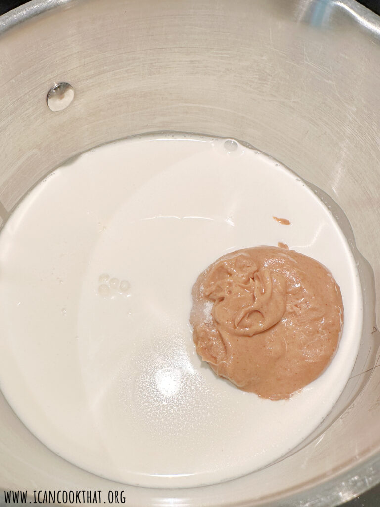 • Whisk to combine, until the sugar and peanut butter are combined into the milk. Continue to heat over medium until the mixture is steaming and begins to bubble around the edges of the pot.