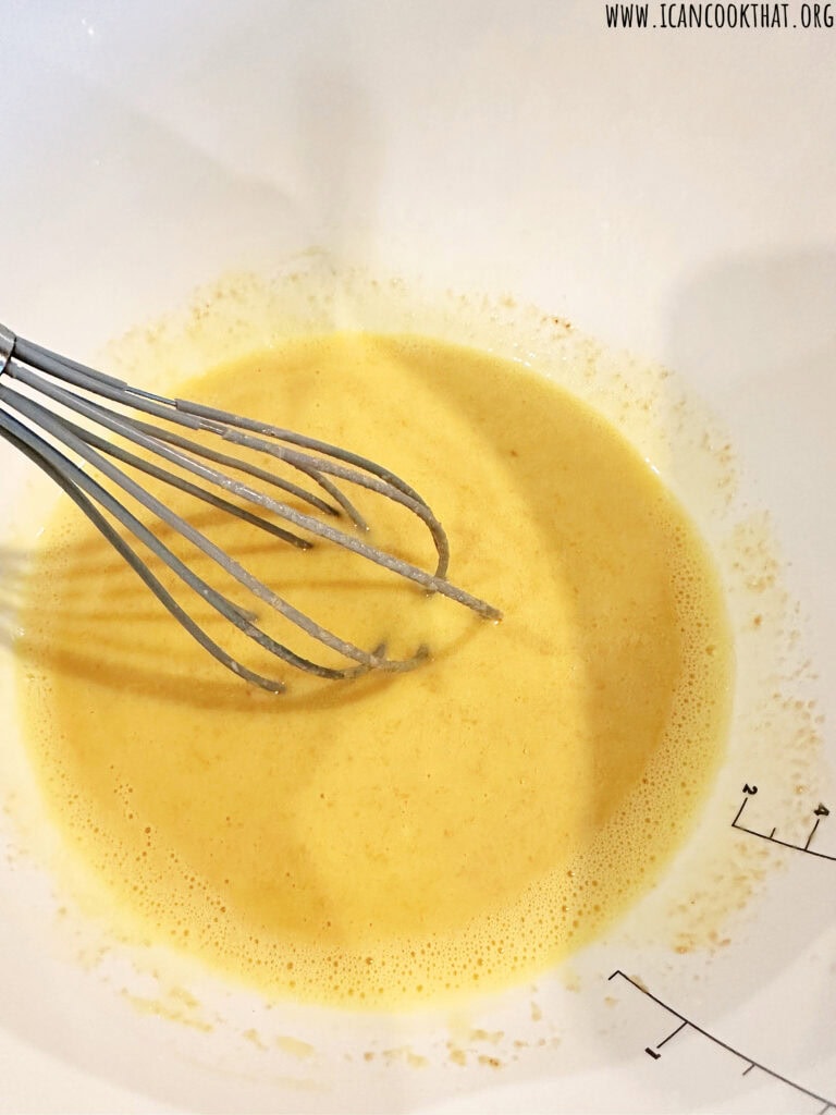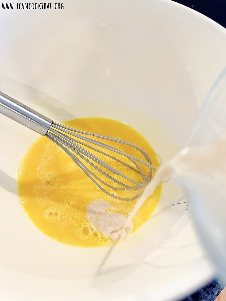 • When the milk mixture is bubbling around the edges, slowly pour 1/2 cup of the mixture into the egg yolks while whisking constantly.